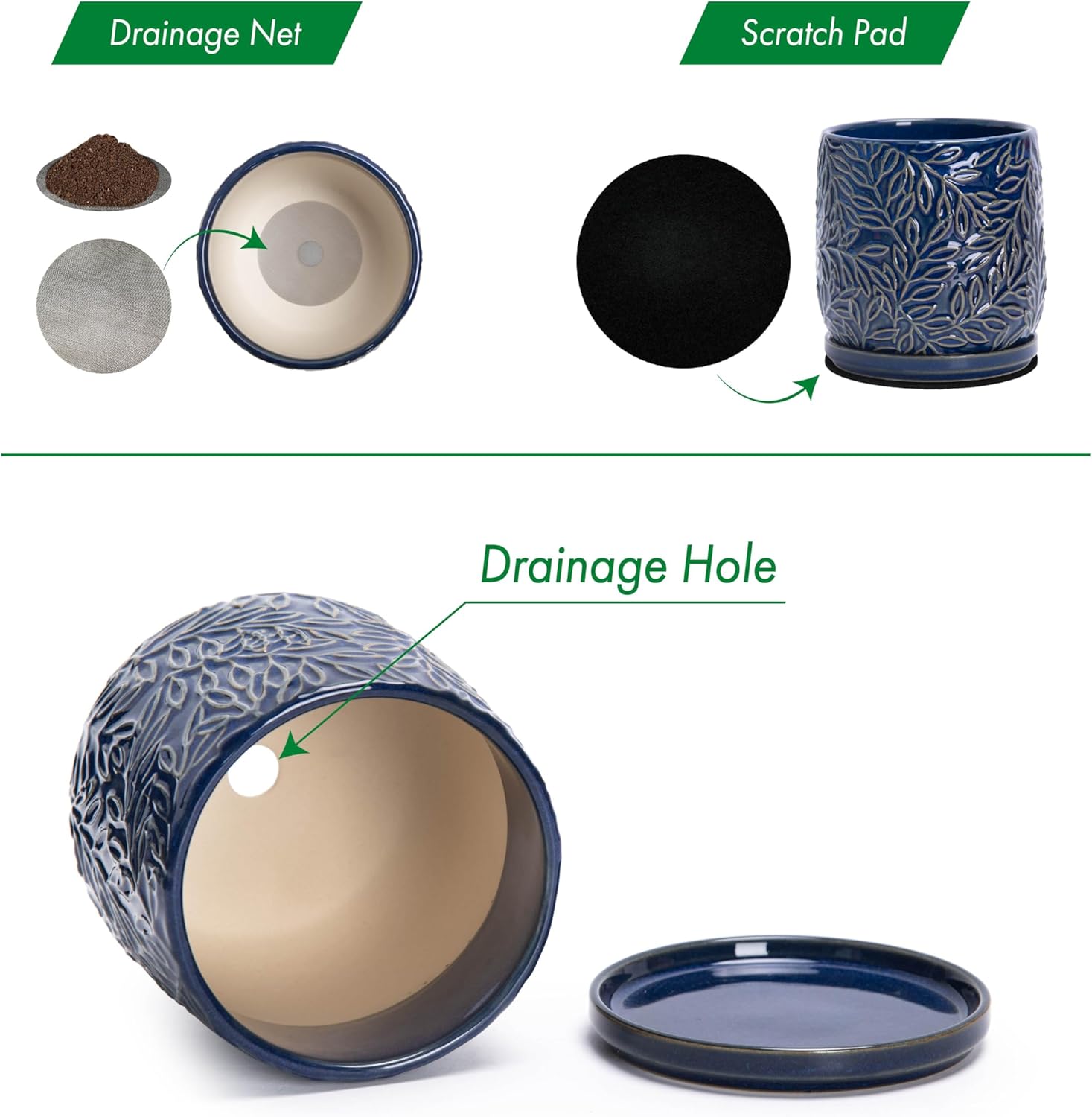 • Drainage Hole and Saucer: Each pot comes with pre-drilled drainage hole and matching ceramic tray to drain excess water.