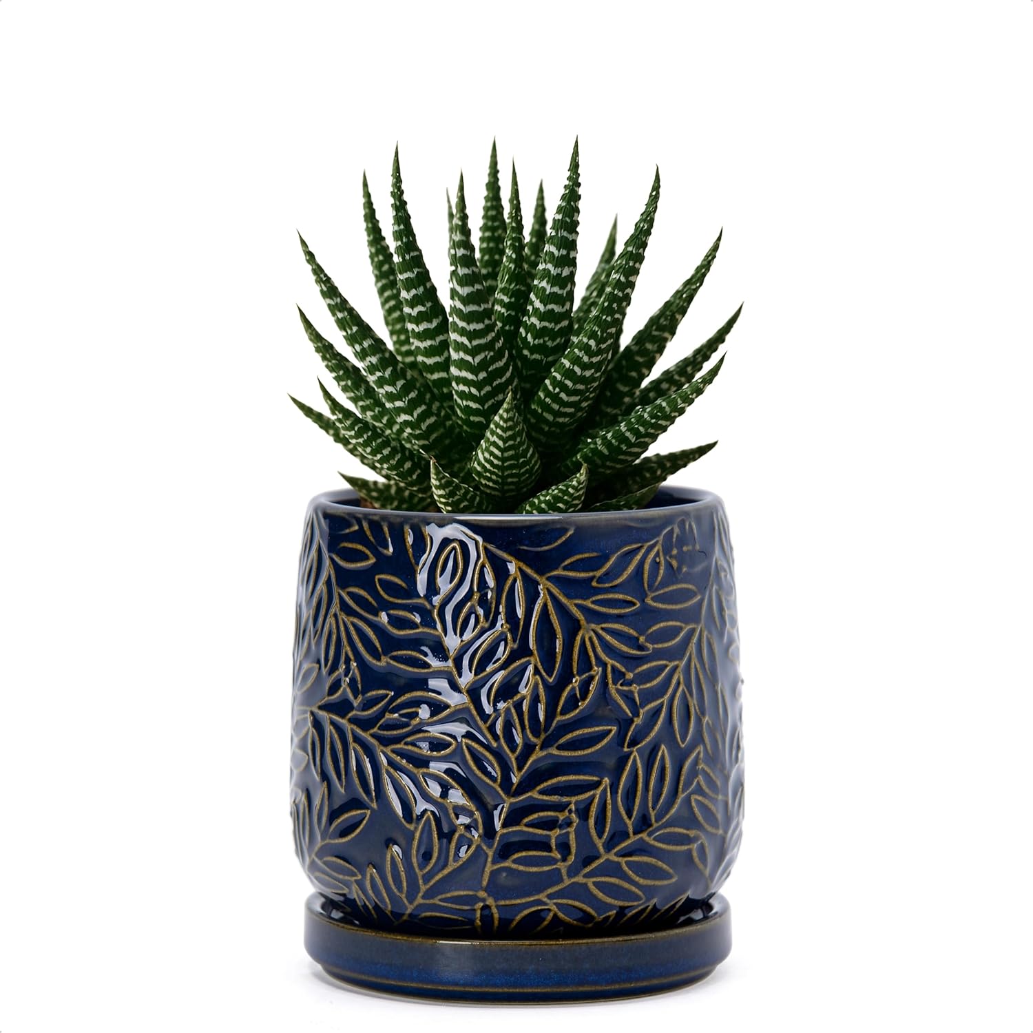 D'vine Dev 4 Inch Embossed Leaves Stoneware Planter Pot with Drainage Hole and Saucer, Midnight Blue, 27-A-Z-3