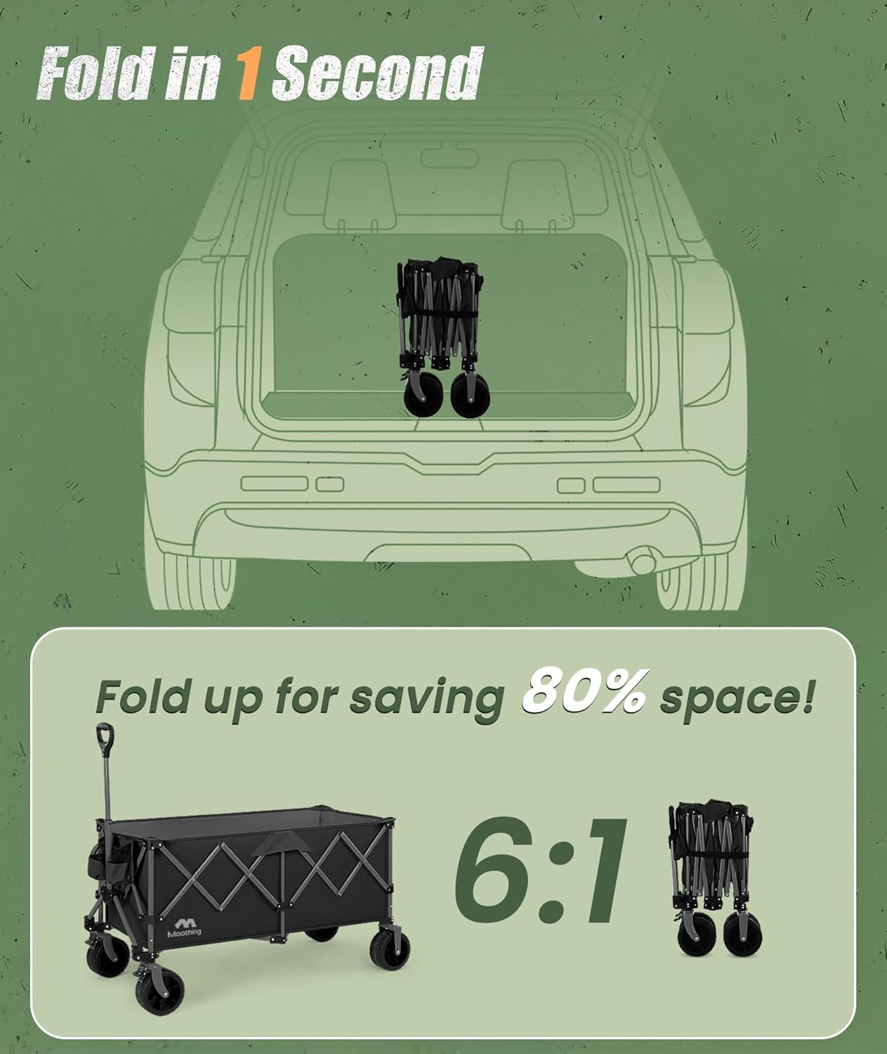 - š²:š šššš«šššš¢šØš§ šššš¢šØ: We understand the importance of efficiency, which is why our wagon cart offers an excellent retraction ratio. This means that when folded, the lounge wagon takes up minimal space, yet expands to provide ample room for your belongings, making folding wagon carts the perfect balance between portability and functionality