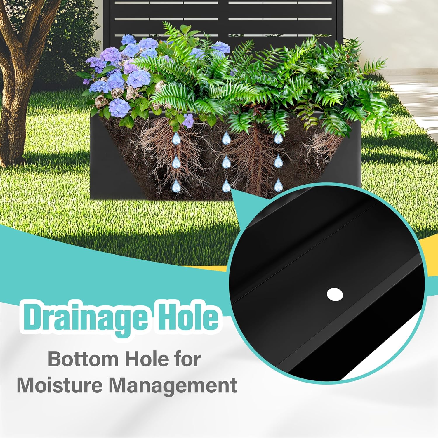 - Built-In Drainage System: The planter box features a 12-inch deep planting bed with drainage holes to prevent waterlogging, ensuring your plants receive the optimal moisture levels for healthy growth.