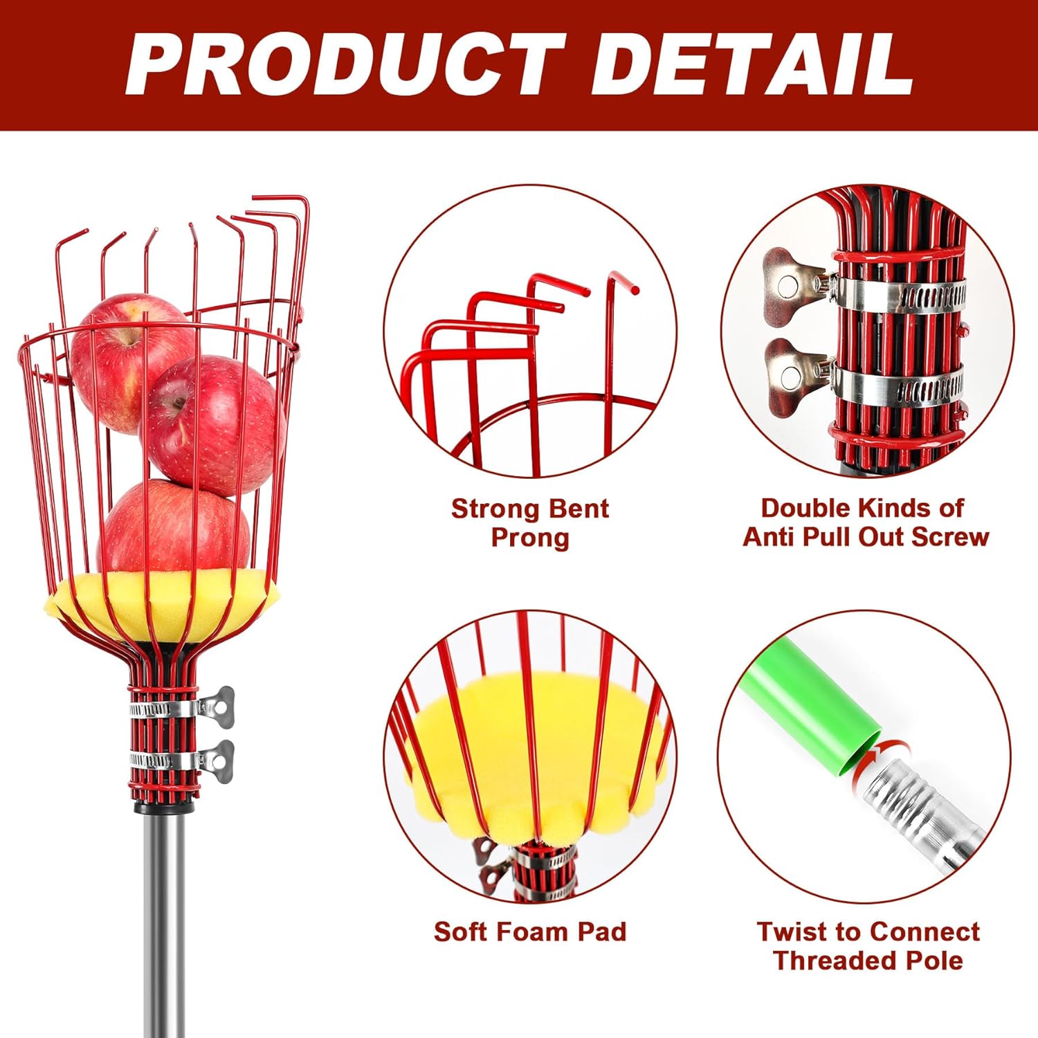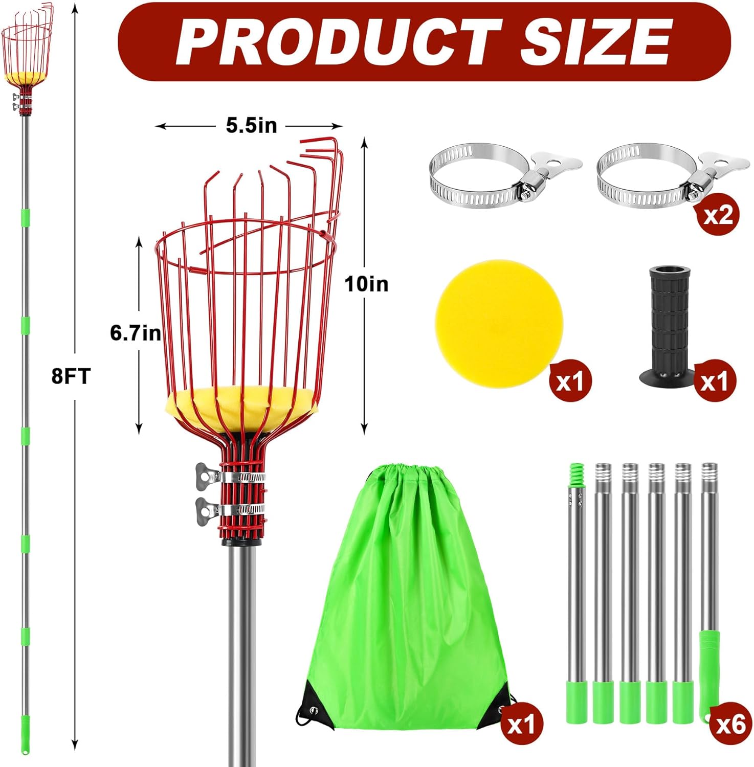 - 8FT Fruit Picker with Basket - This fruit picker tool is equipped with a large-capacity metal basket with a diameter of 5.5 inches, along with 6 assembly poles, a sponge pad, and a green storage bag, protecting fruits from damage while also making it convenient to carry them. It is suitable for picking fruits with diameters ranging from 1.25 to 5.5 inches.