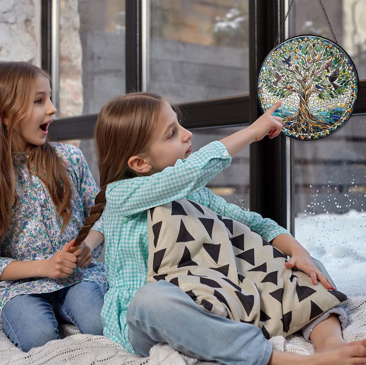 Tree of Life with Birds Sun Catcher RVEAFA Stained Glass Window Hanging Birds Lover Gifts for Women Wall Decor Handmade Sun Catcher Decoration for Garden Home Housewarming Gifts(20 * 20cm