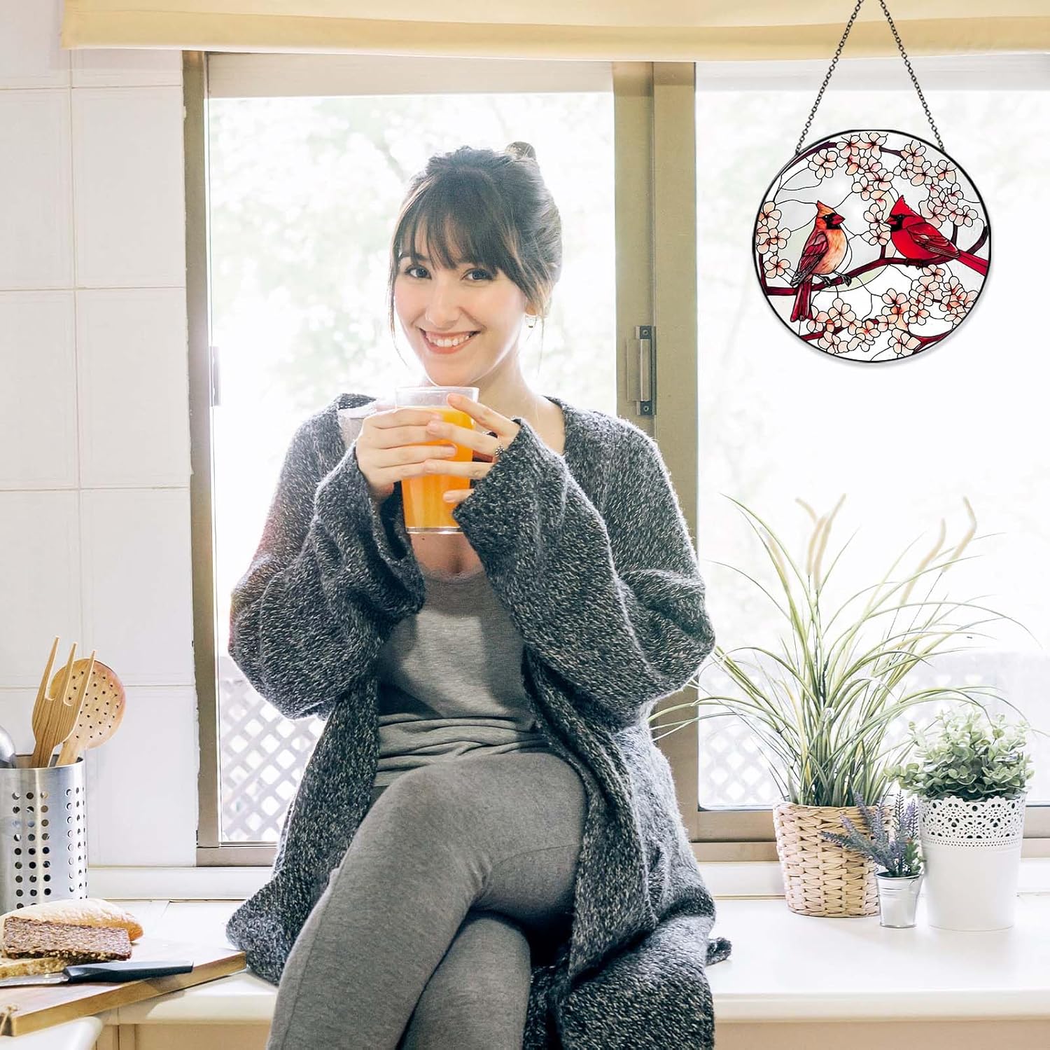 Cardinal Sun Catcher RVEAFA Stained Glass Window Hanging Cardinal Decor Gifts for Women Handmade Sun Catcher Decoration for Garden Home Housewarming Gifts Mother Day