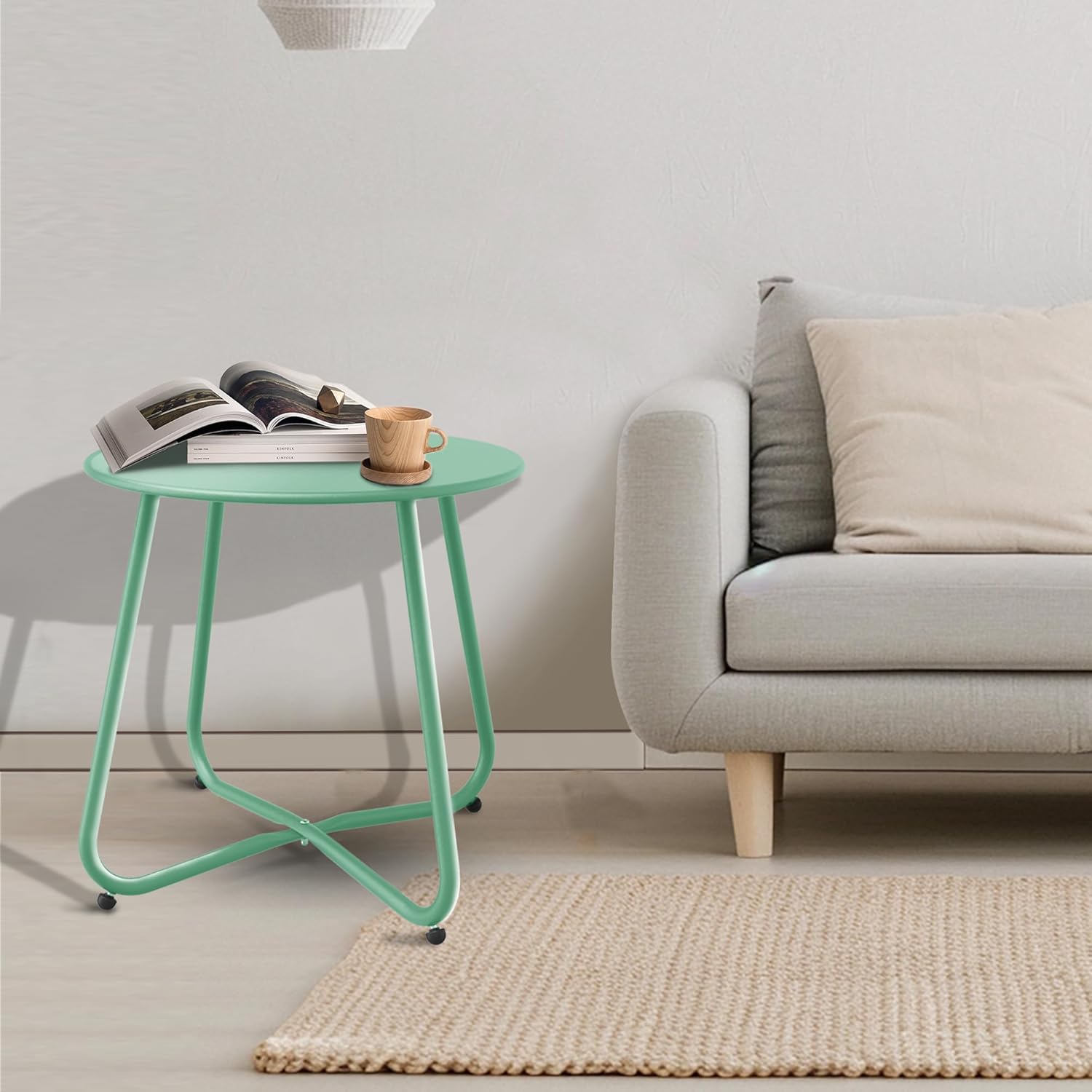 Patio Side Table Waterproof Round Metal Steel Weather Resistant Portable Outdoor and Indoor End Table for Garden Balcony Yard, Bean Green