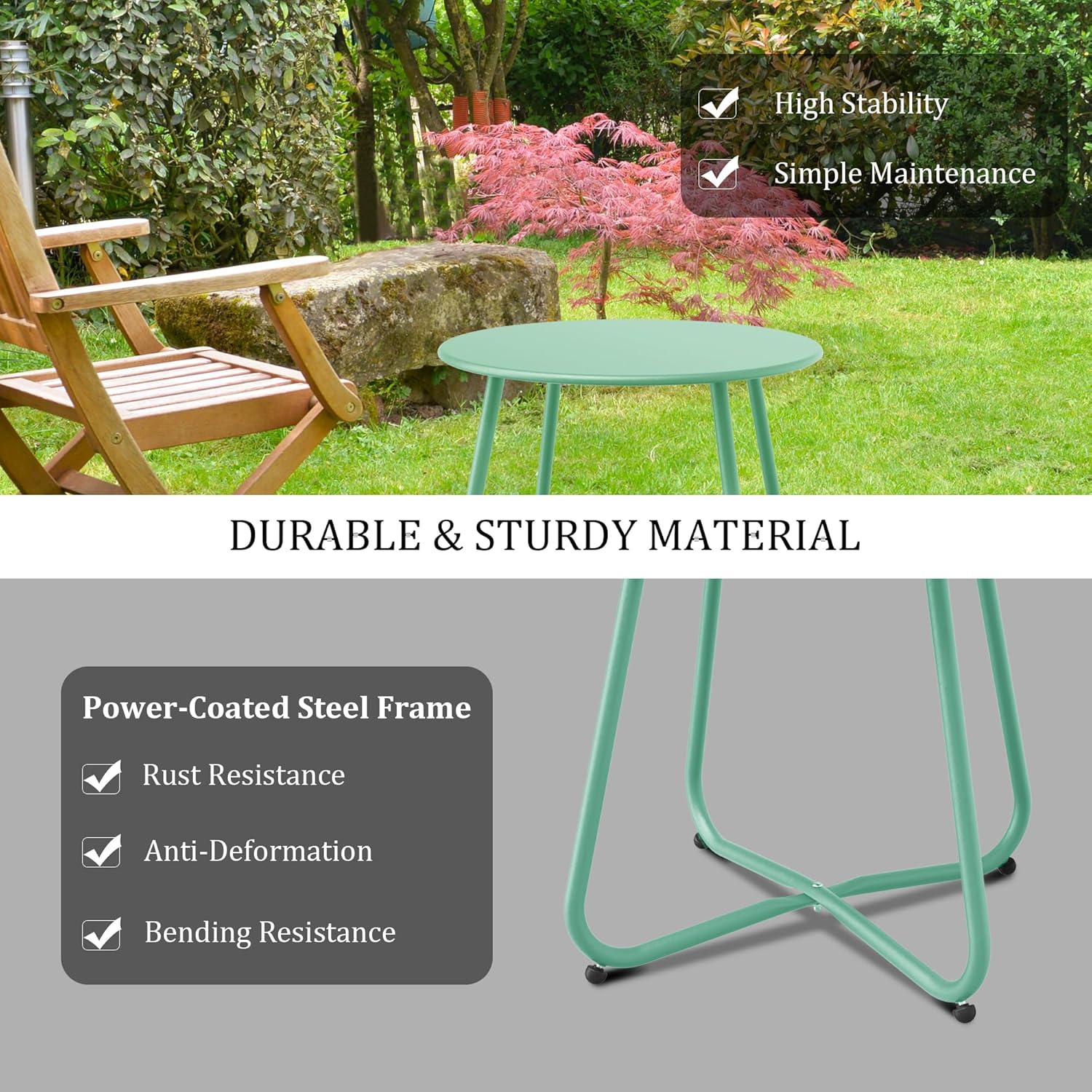 - Durability: Our small round table features an electrophoresis and powder coating technology that creates a glossy surface with anti-rust properties. Whether under the sun or in rainy conditions, this outdoor side table is built to endure. The powder coating is weather-resistant, waterproof, and wonβt peel off. Additionally, it is scratch-resistant and UV-resistant, making it perfect for use in your yard or on your balcony.
