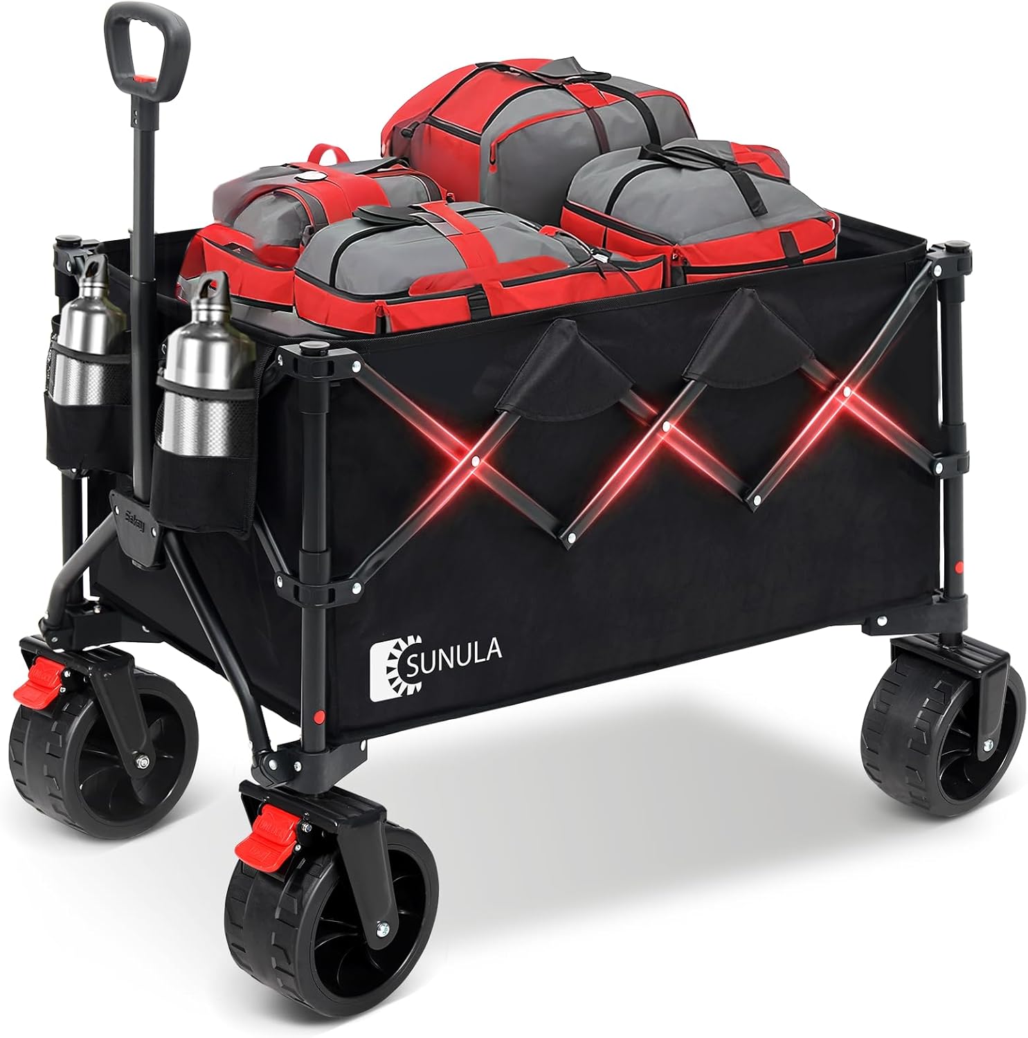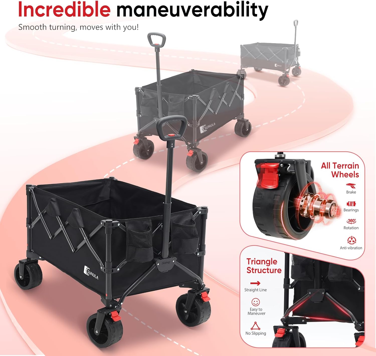 Collapsible Wagon Cart with 440lbs Weight Capacity, Heavy Duty Foldable Wagon with Big All-Terrain Wheels & Drink Holders, Utility Carts for Camping, Garden, Outdoor, Grocery, Sports. Black