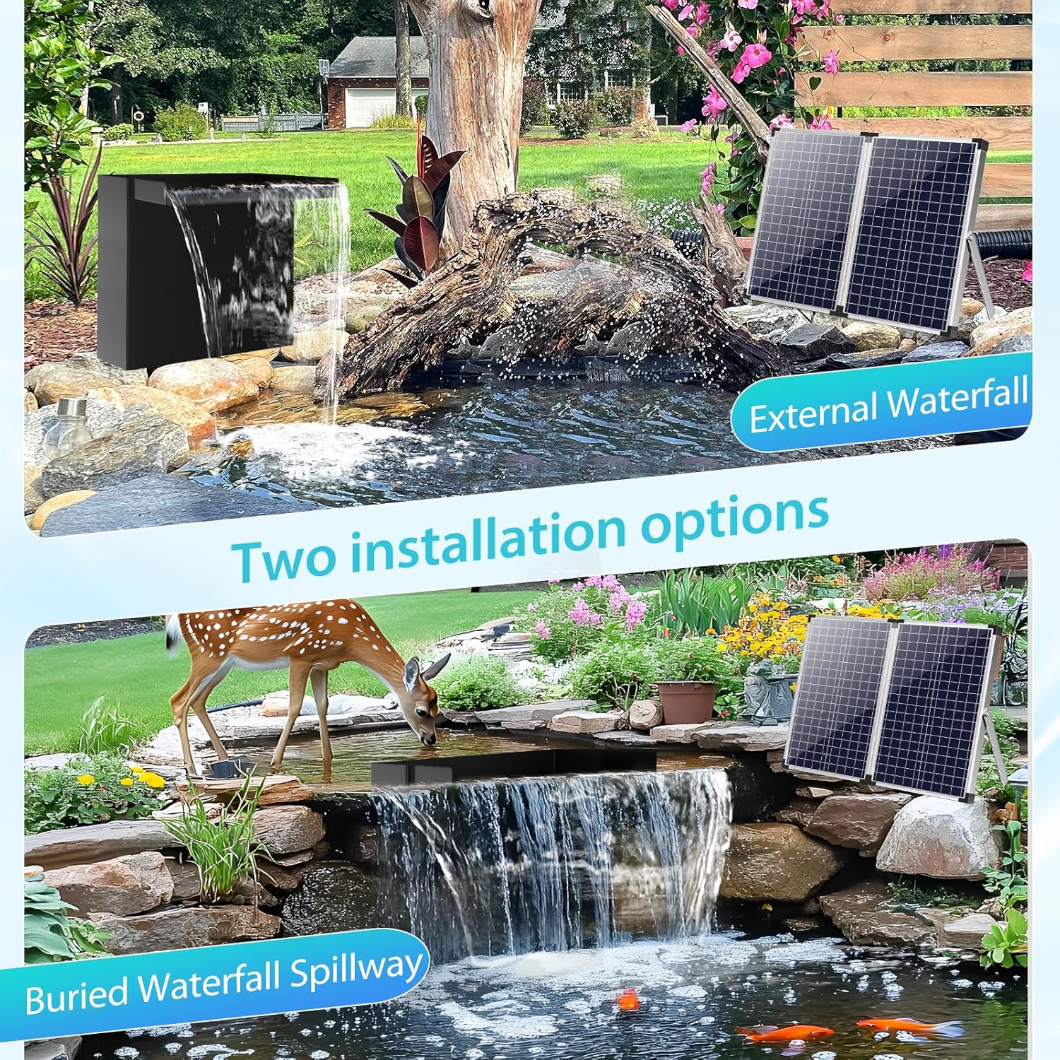 - [Versatile Dual-Installation Options]This solar waterfall spillway kit supports two installation styles to suit your pond or garden layout. Choose External Waterfall Installation for an above-ground waterfall feature, or opt for Buried Waterfall Spillway for a seamless, natural pondless waterfall effect. No matter how you install it, you’ll enjoy a smooth, mesmerizing water display.