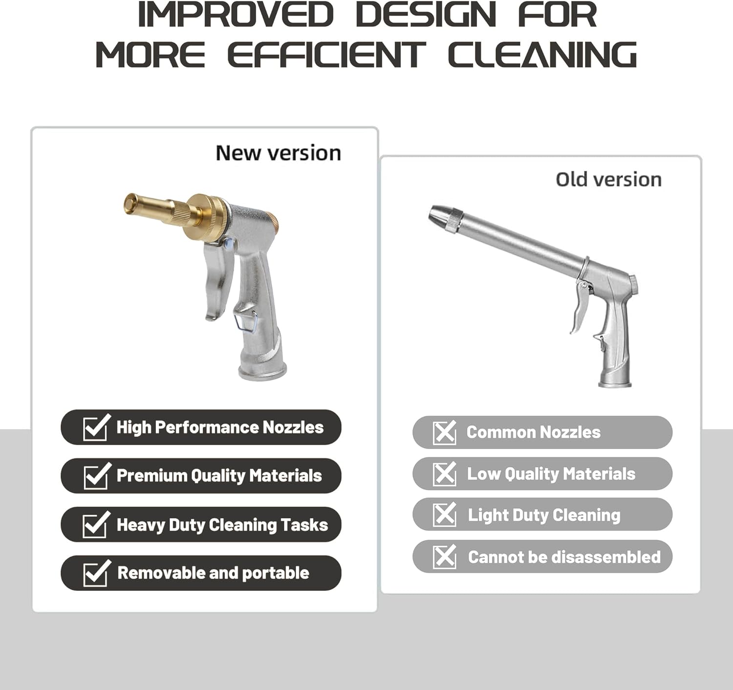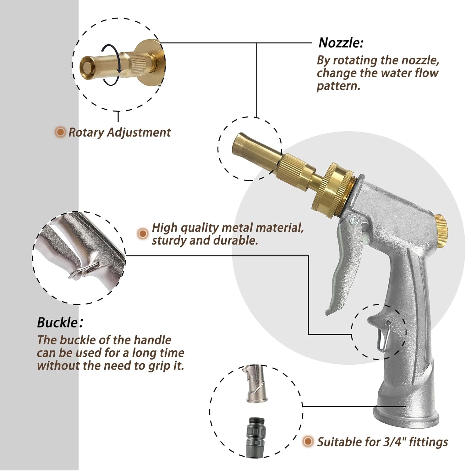 - 【Brass Metal Nozzle Sprayer with Plastic Soap Dispenser Bottle】This hose nozzle sprayer has brass adjustable long nozzle and zinc alloy gun body, durable and powerful. Gun is much stronger than all plastic ones. Comes with 3.5oz/100cc plastic soap dispenser bottle, just put the detergent into the bottle,and will be perfectly combined with water.