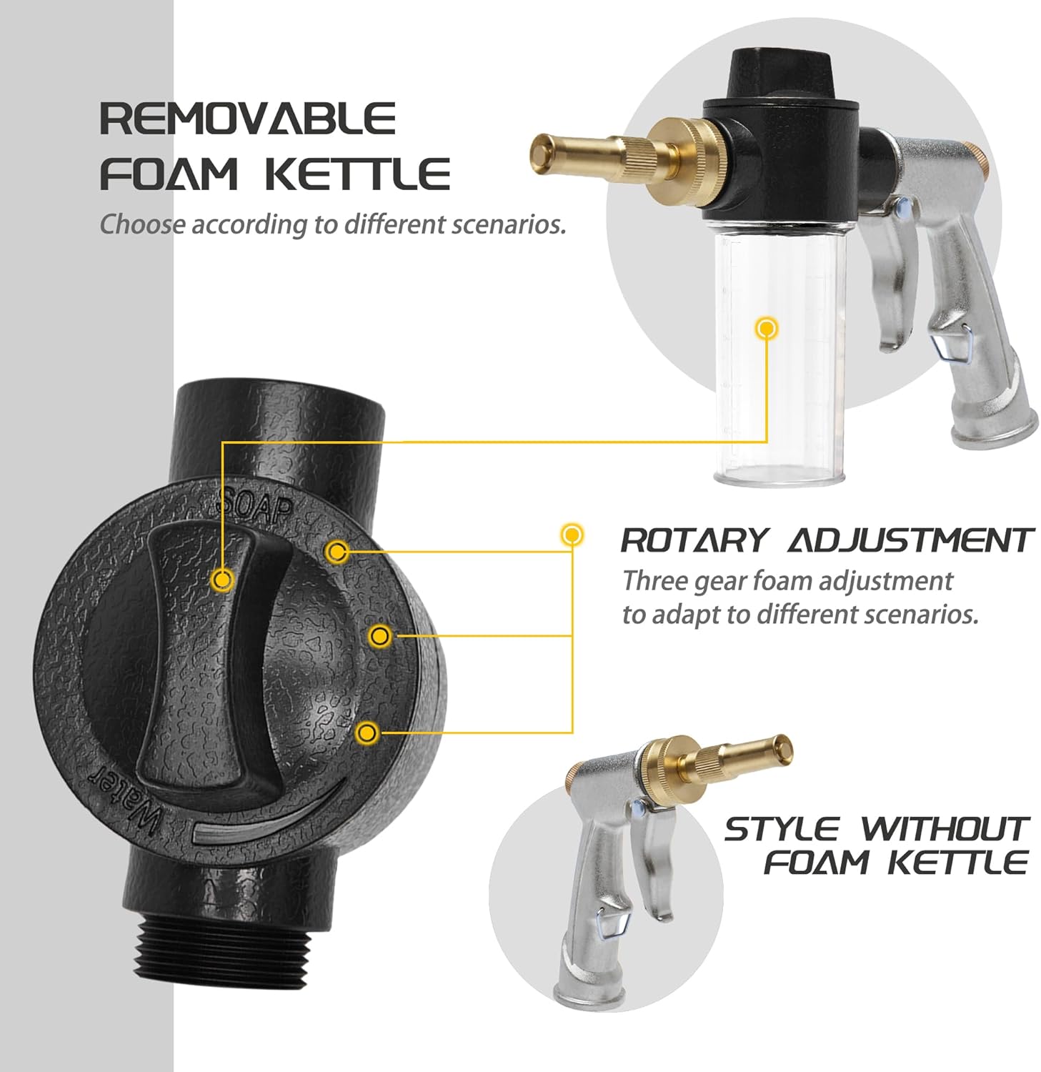 - 【2 In 1 Hose Nozzle Sprayer】This foam gun sprayer is useful, if you don't need to use the soap solution, you can remove the soap dispenser bottle and attach the metal nozzle directly to the brass handle making it a high quality metal hose nozzle!