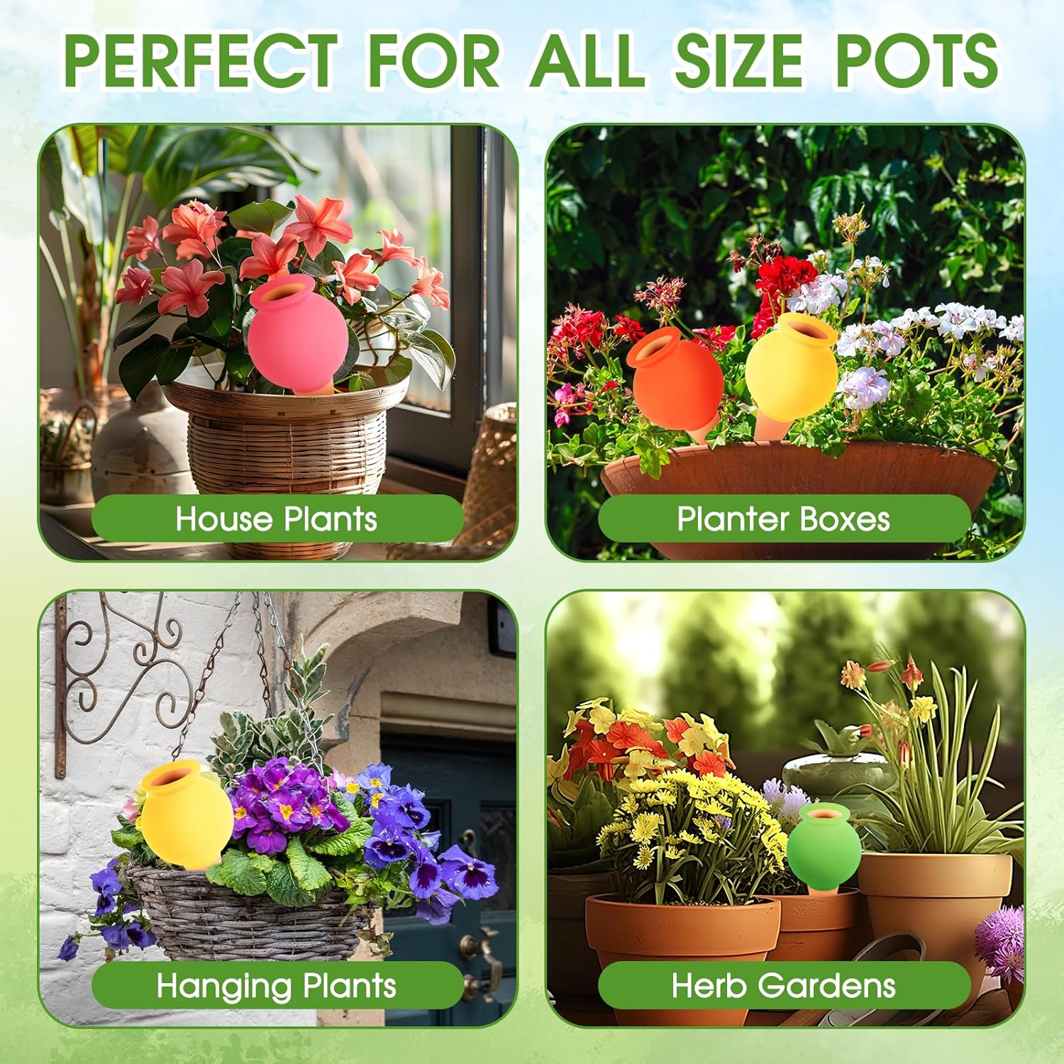 - Versatile for All Pots:These self-watering planter inserts are perfect for all size pots, including house plants, planter boxes, hanging plants, and herb gardens. No matter what type of plants you have, these spikes will work great.
