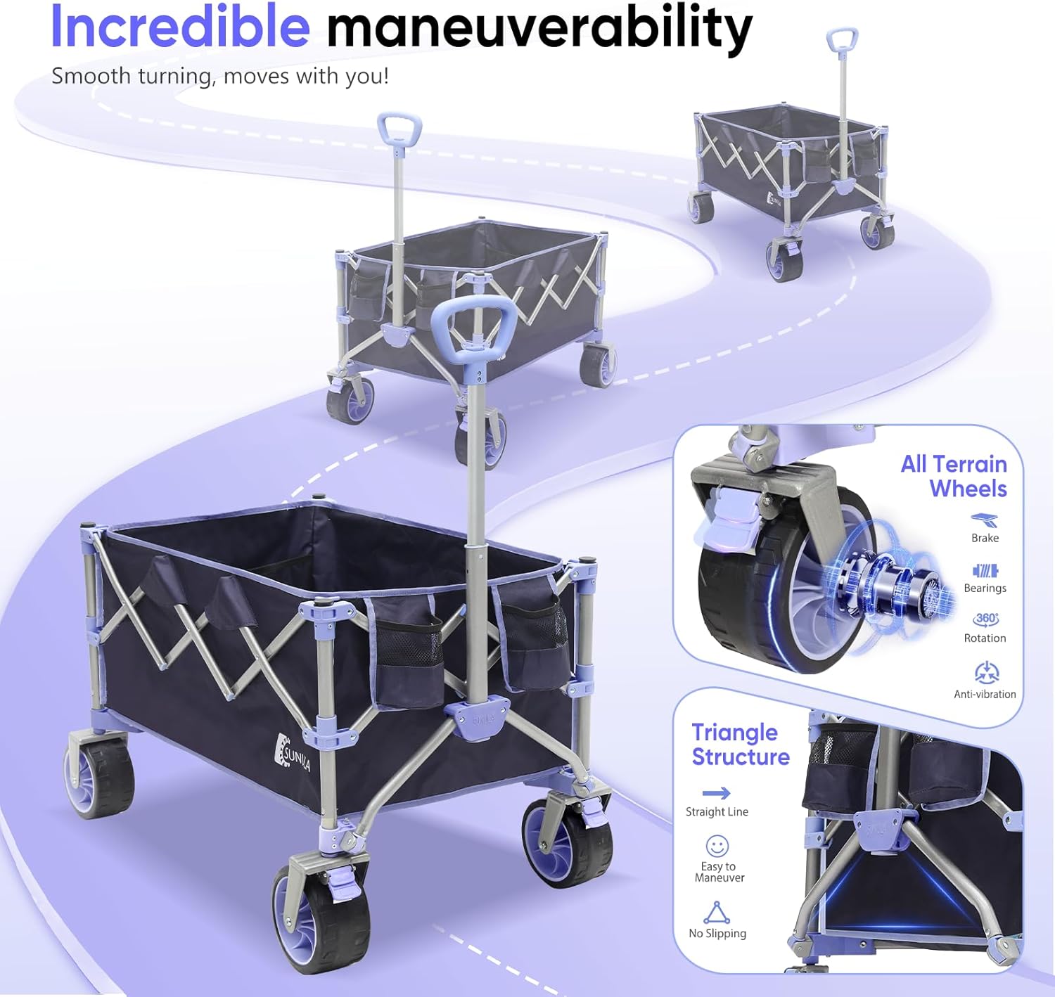 Collapsible Wagon Cart with 440lbs Weight Capacity, Heavy Duty Foldable Wagon with Big All-Terrain Wheels & Drink Holders, Utility Carts for Camping, Garden, Outdoor, Grocery, Sports. Blue