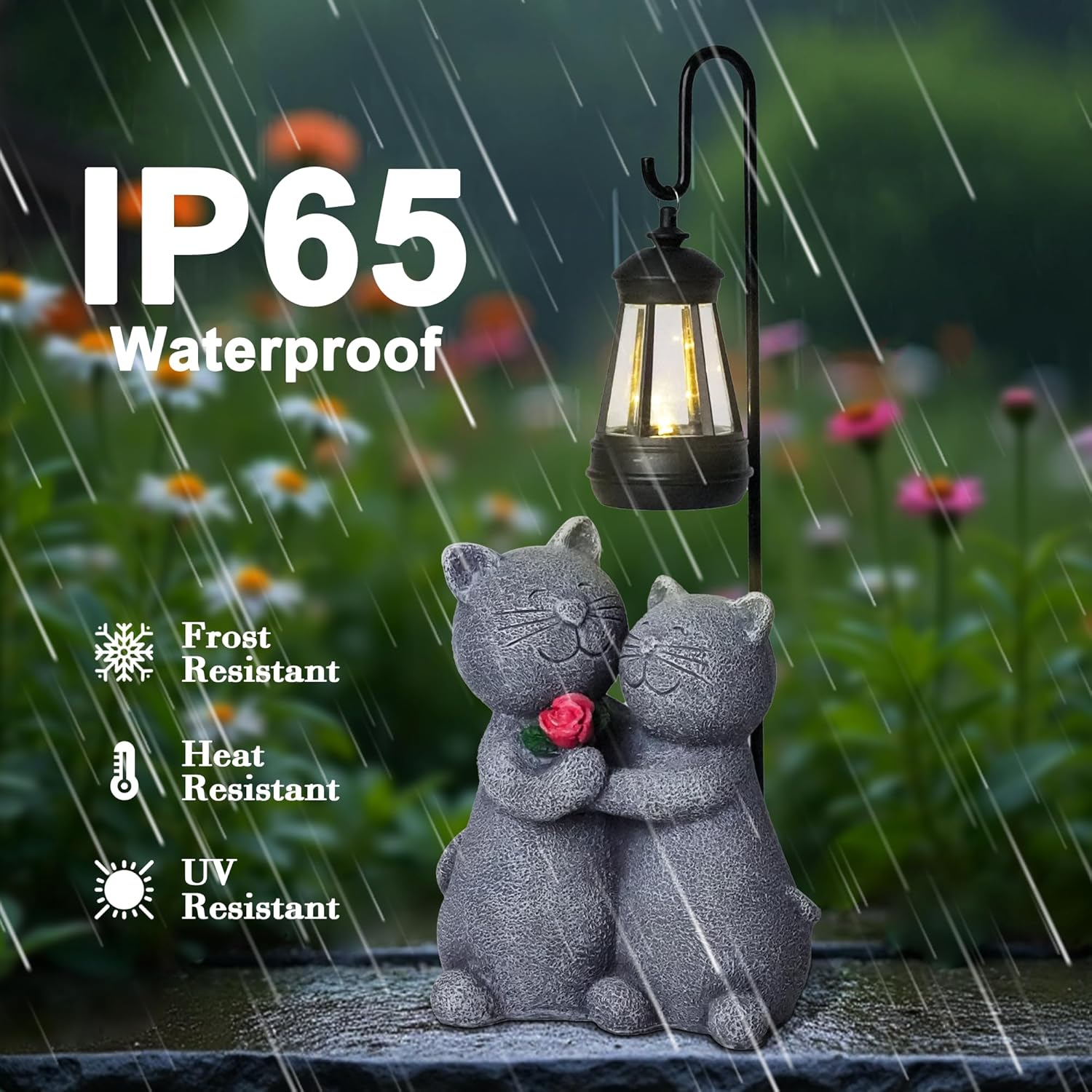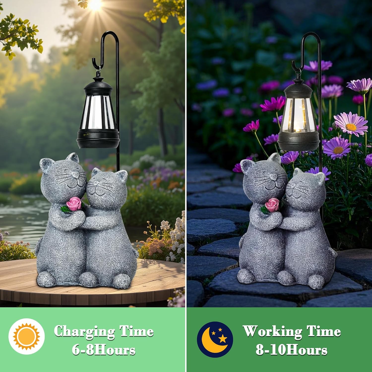 - 【Adorable Cat Couple Design】 – This solar cat garden statue features a sweet cat couple holding a rose, symbolizing love and companionship, adding a warm and heartfelt touch to your home