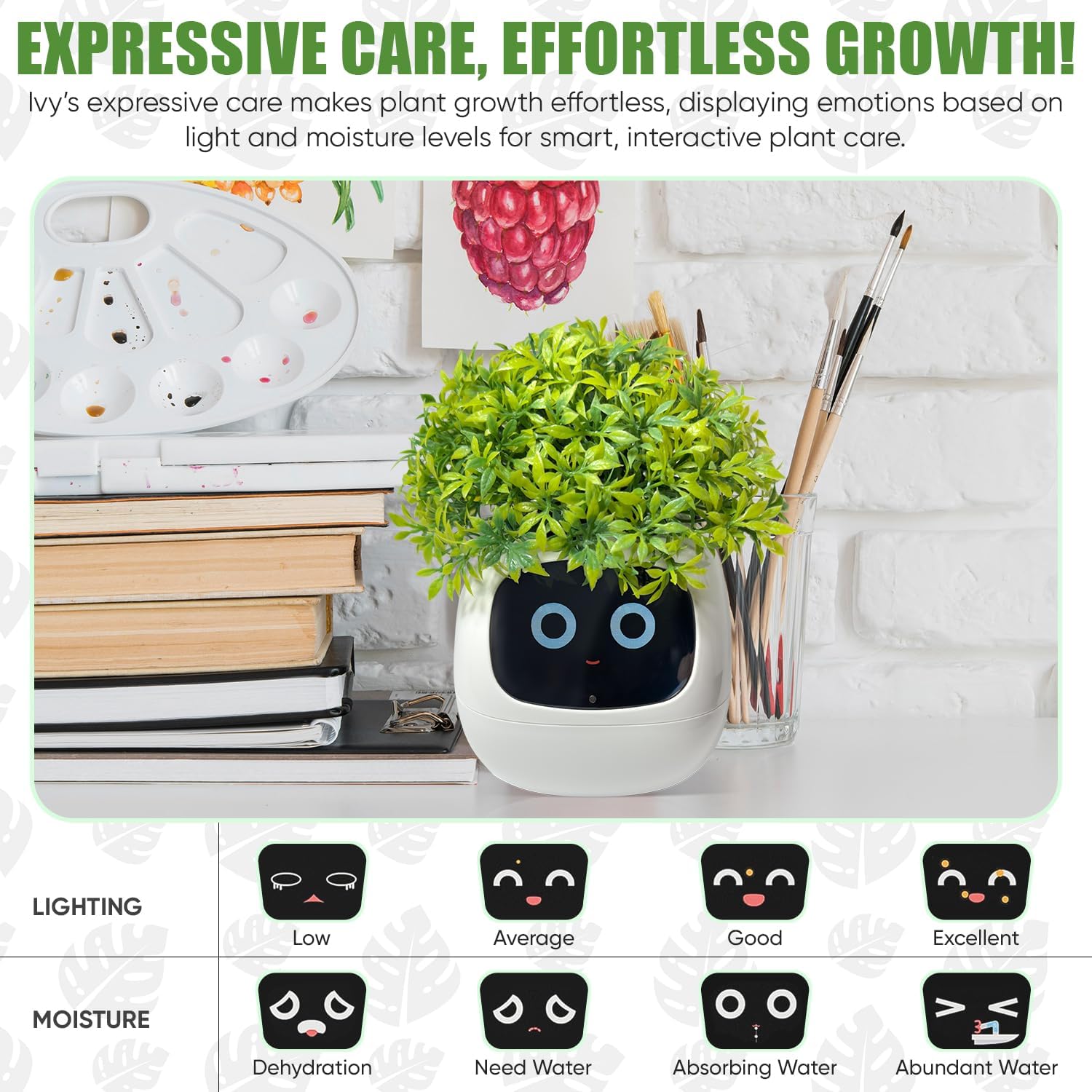 - STYLISH HOME DECOR – Bring a modern, tech-savvy touch to your home with the Ivy Smart Planter. Featuring a robotic flowerpot with a face, it serves as a stunning decor piece while caring for your plants. It’s the perfect conversation starter for any room.
