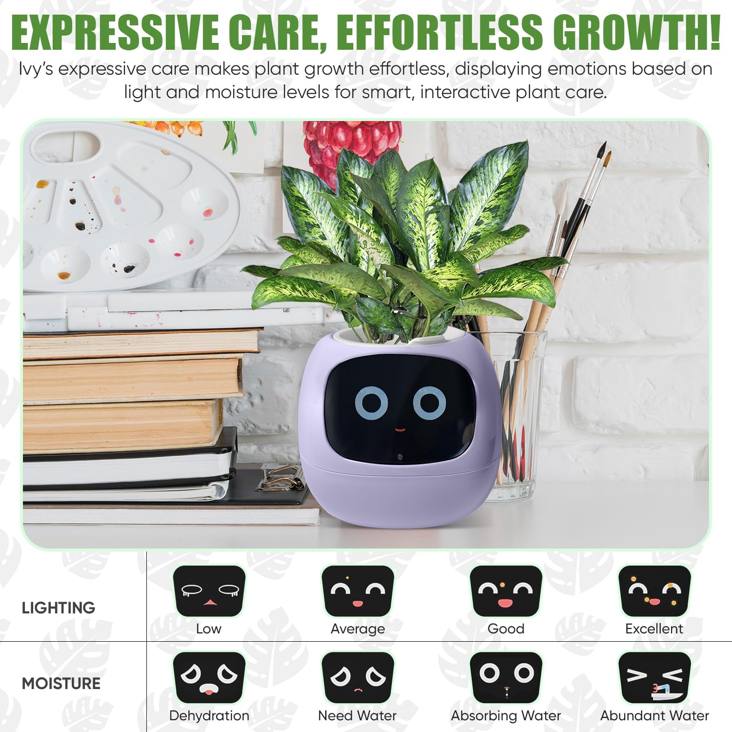 - AI- EASY PLANT CARE – Imagine your plants thriving with minimal effort. The Ivy Smart Planter features AI-powered Plantagotchi technology that interacts with your plants, reminding you when it’s time to water and giving your plants a personality with its robotic flower with feelings.