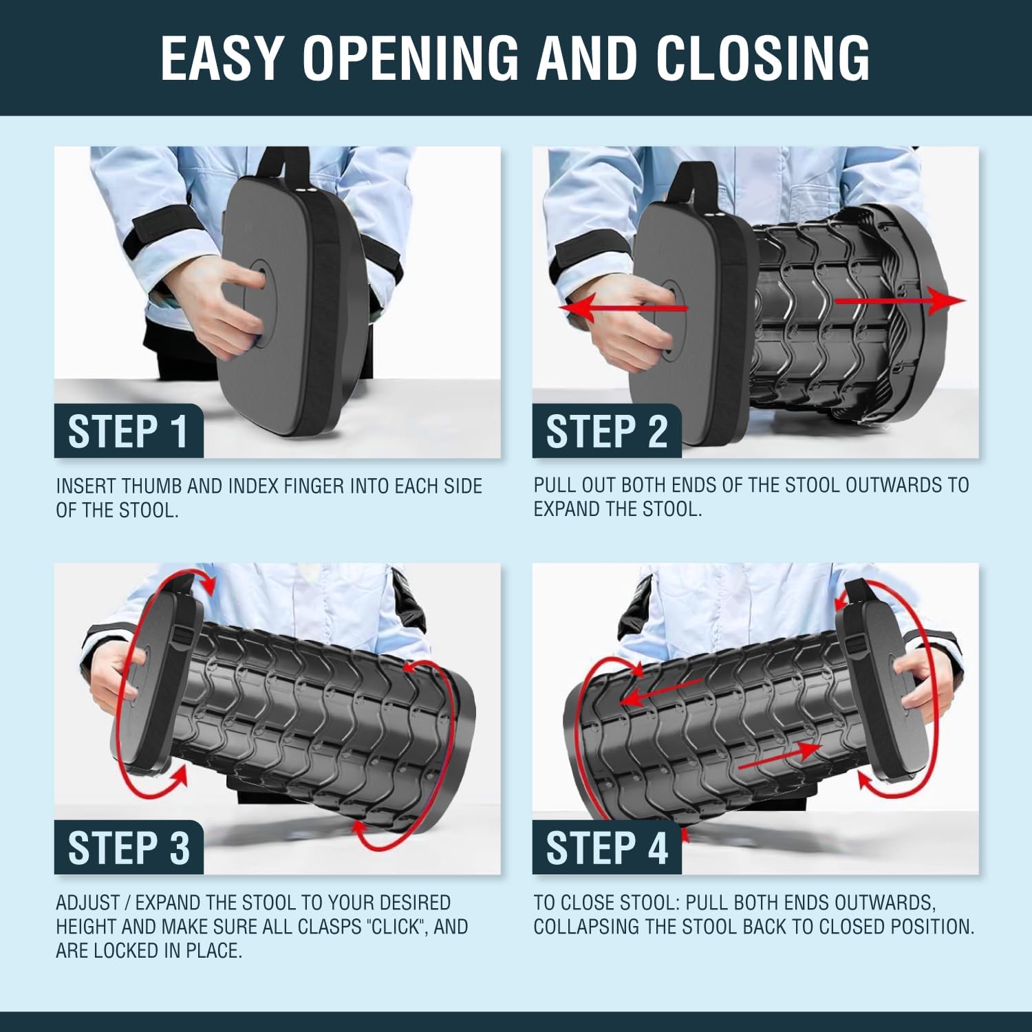 - 😇【PORTABLE SEAT SIZED FOR EVERYONE】Enjoy a Sturdy, Strong, Lightweight Retractable Folding Stool. Our Portable Travel Seat can support up to 620lbs. Fully collapsed/closed, your Portable Collapsible Stool is only 2.5 x 10 in., but will expand up to 18 in. tall or to your desired adjusted height.