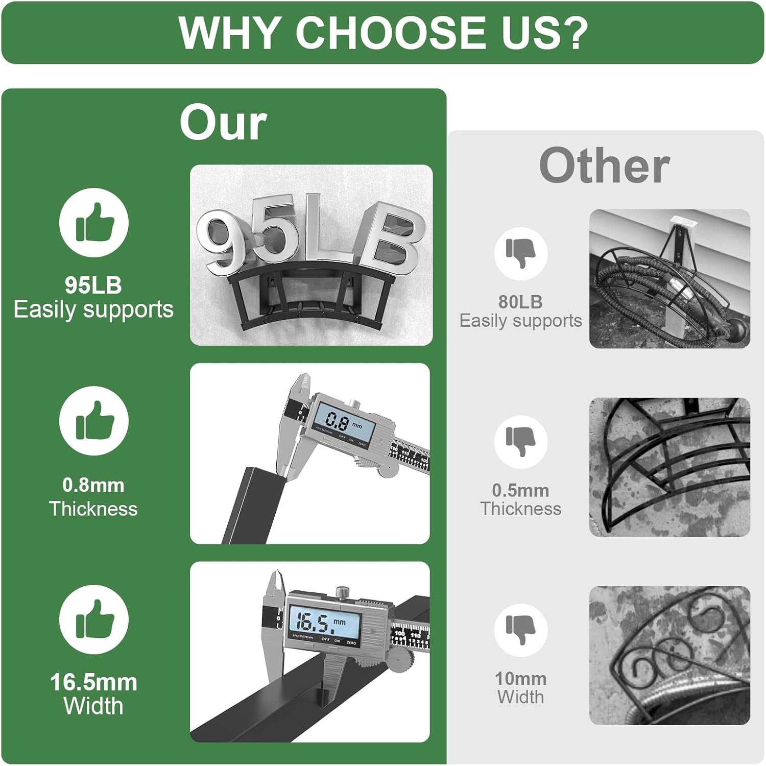 - [HEAVY DUTY HOSE HOLDER]:This garden hose holder wall mounted can hold up to 125 feet of hose. Gives strong reliability with up to 95 lbs of bearing weight. Our garden hose holder was made of high-strength and heavy-duty metal, 0.8mm thickness and 16.5mm width, other hose holder is 0.5mm thick and 10mm wide. So our hose rack is stronger that keep from bending and provide great load-bearing capacity