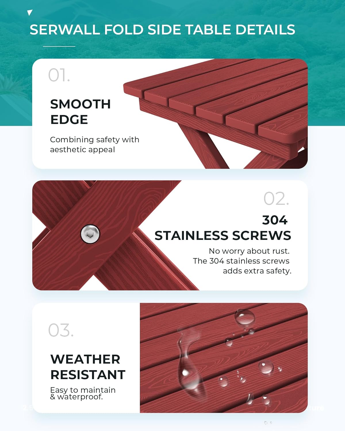 - [Foldable Outdoor Side Table] The SERWALL Adirondack Side Table features a foldable design that significantly reduces its footprint when folded, providing an optimal space-saving solution for outdoor enthusiasts.