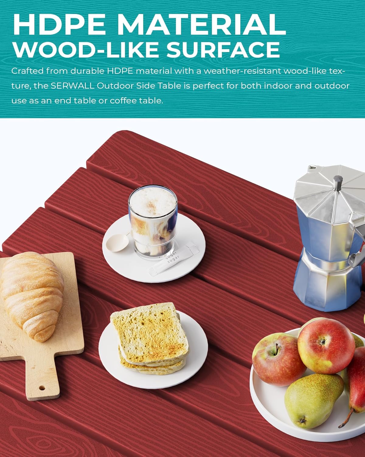- [Low Maintenance Beauty] The SERWALL outdoor end table's wood-textured HDPE surface requires no painting or staining. A simple soap and water clean ensures a pristine look, making it the ultimate in easy maintenance.