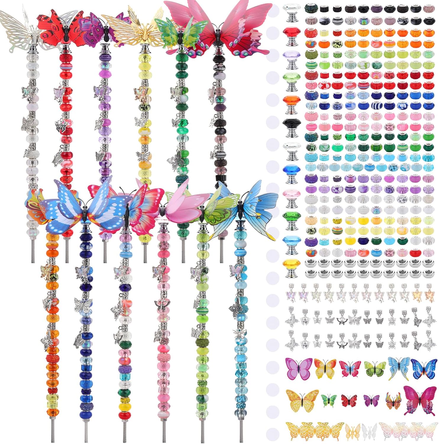 - Package Included: Our butterfly beaded garden stakes are decorated with simulated butterfly accessories that flutter in the wind, with colorful beads to help your garden add more style. You will receive a total of 380 products, including 12 crystal stoppers, 12 10-inch threaded rods, 240 beads, 56 butterfly decorations, 12 screw caps, 20 glue dots