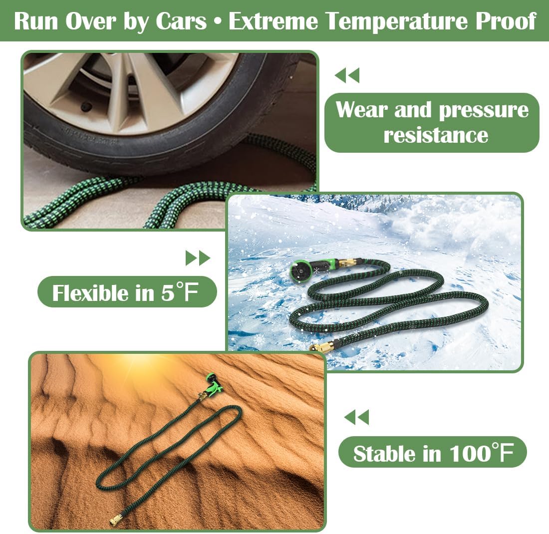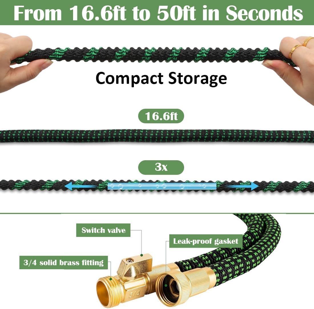 - EXPANDABLE HOSE: Starts compact at 16.6ft, stretches to 50ft when pressurized; solid brass fittings withstand -40°F to 200°F; 10 spray modes for gardens, cars, pets
