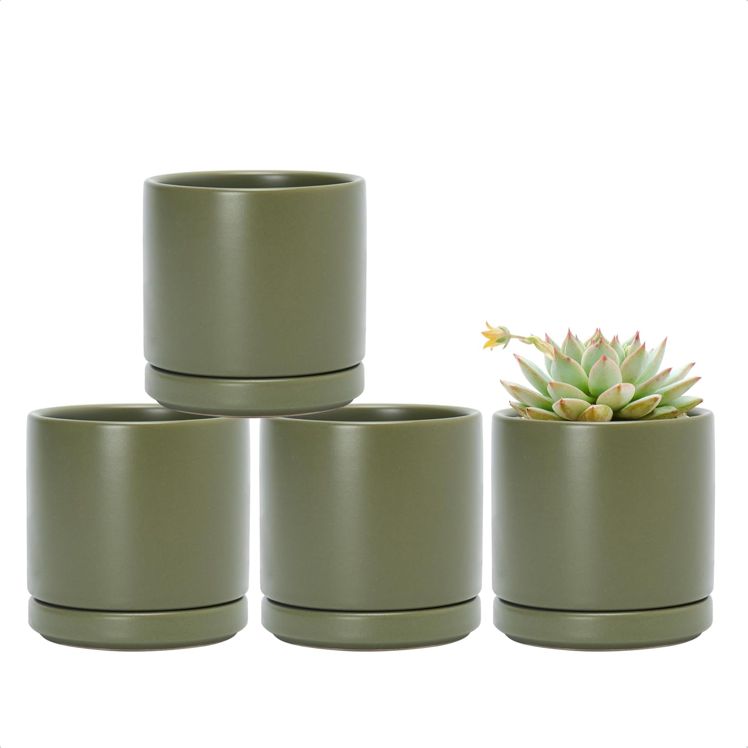 D'vine Dev Set of 4 Small Ceramic Plant Pots, 3.5 Inch Succulent Planter Pot for Plants with Drainage Hole and Saucer, Olive, 94-X-A-0