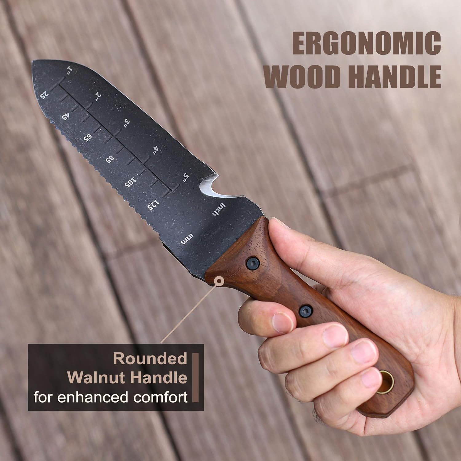 TOPLINE Hori Hori Garden Knife with Oxford Sheath, 7" Stainless Steel Blade with Cutting Edge, Full Tang Walnut Handle with Hanging Hole, Multifunctional Garden Tools for Weeding, Planting, Cutting