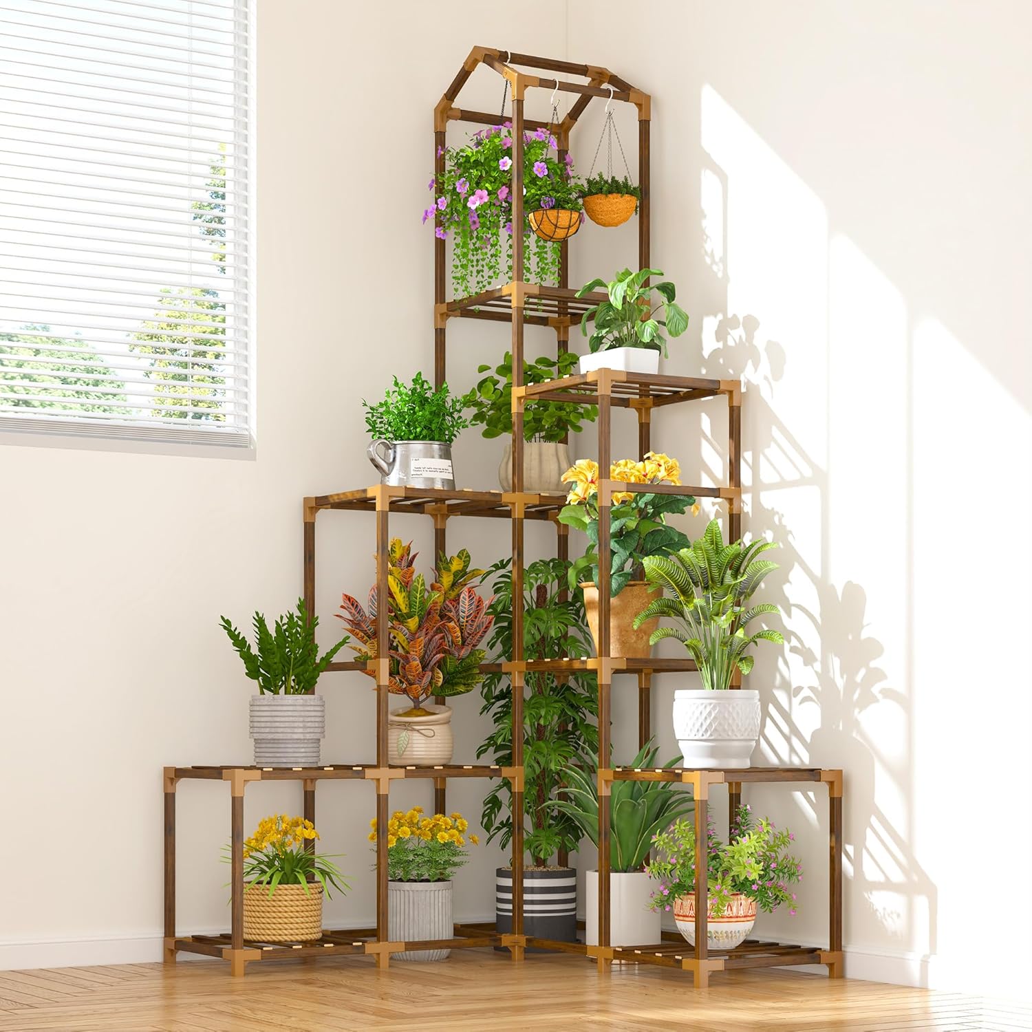 EnHomee 64.2" H Plant Stand Indoor Outdoor Tall Plant Shelf for 13-19 Pots Corner Tiered Plant Stands for Multiple Plants Wood Hanging Plants Holder for Garden Balcony Patio Window Porch
