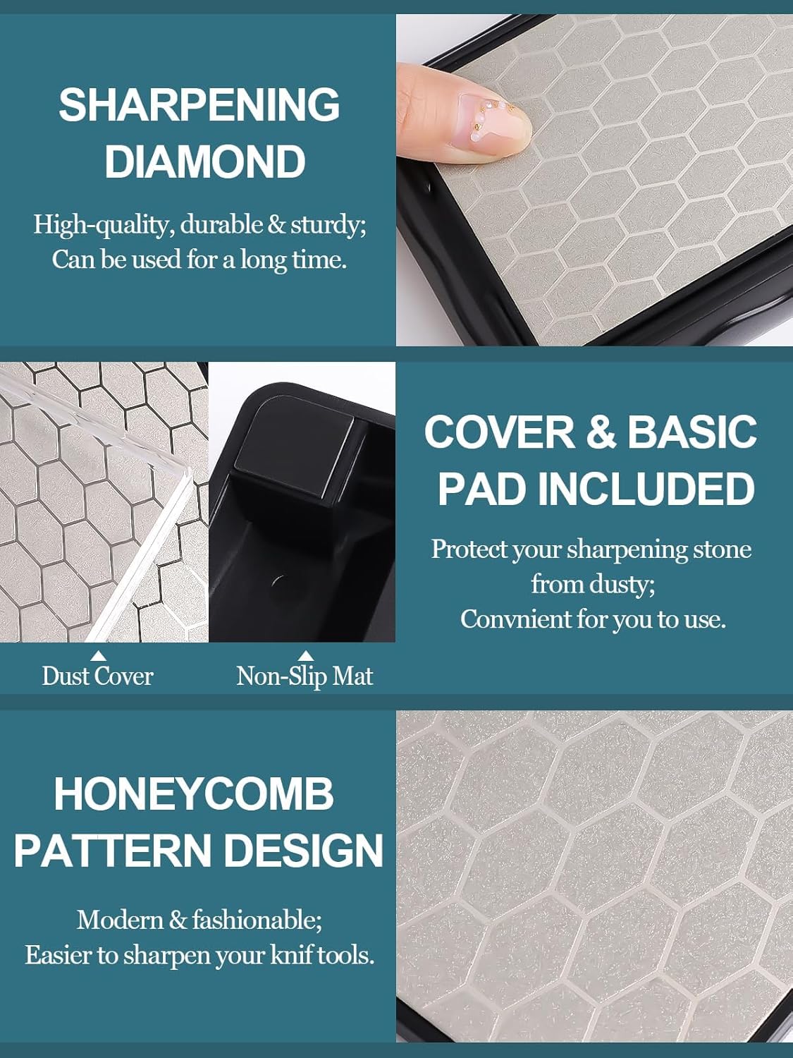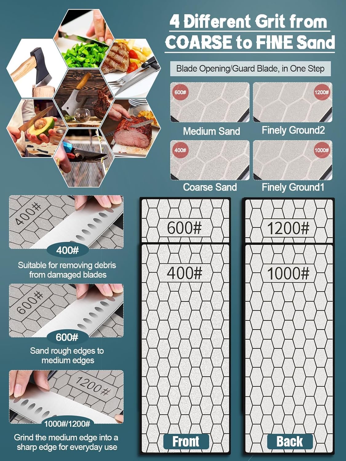 - 4 Different Grits Sharpening: You will receive the whetstone in 4 different sides, 400# & 600# side for grit coarse sharpening and 1000# & 1200# side for grit fine sharpening. The unique honeycomb design ensures that the dust generated during the grinding process will not affect the sharpening.
