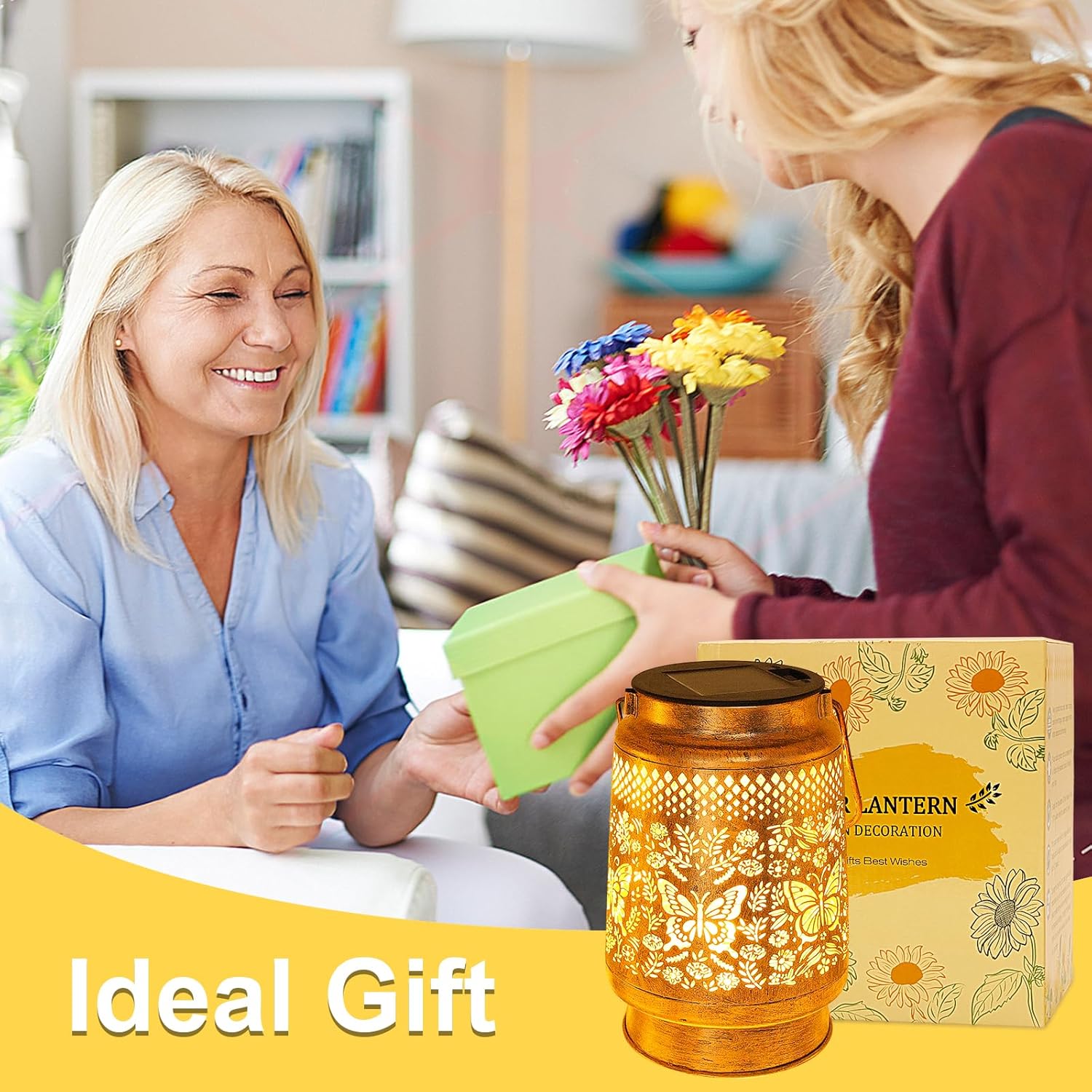 2 Pack Solar Lanterns Outdoor Butterfly Garden Decor, Birthday Gifts for Women Mom Grandma Waterproof Metal Hanging Solar Lights LED Decoration with Shepherd Hook Outside for Yard Porch Lawn Patio