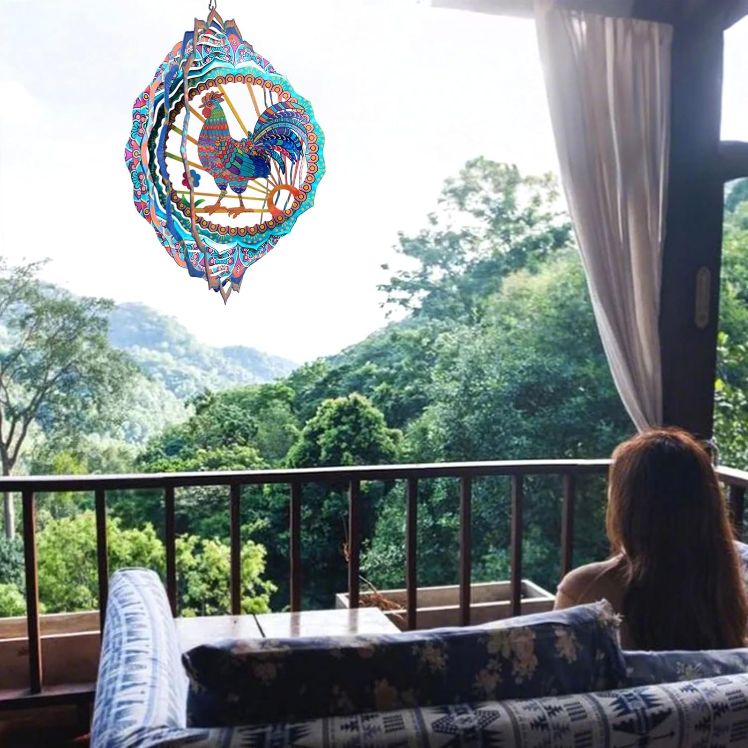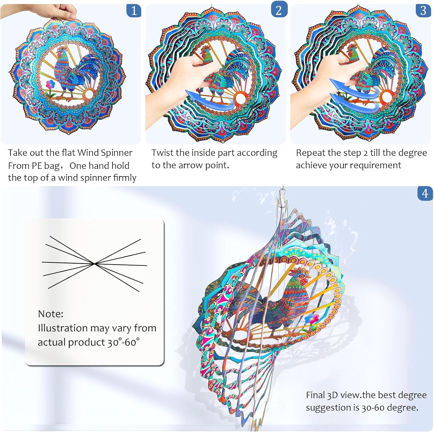 - â ăFascinating 3D Reflective Wind Spinneră12 inch colorful yard art rooster wind spinner follows the trendy kinetic art design style. The wind spinners hanging can rotate 360°,creating a magical 3D stereoscopic visual effect by different colors on the surface,Reflective gilt powder material gives off a sparkling,like a beam of sunlight through the night and bringing you strength,courage and vitality,add captivating and magical visuals and bring stunning views to your home,garden and yard.