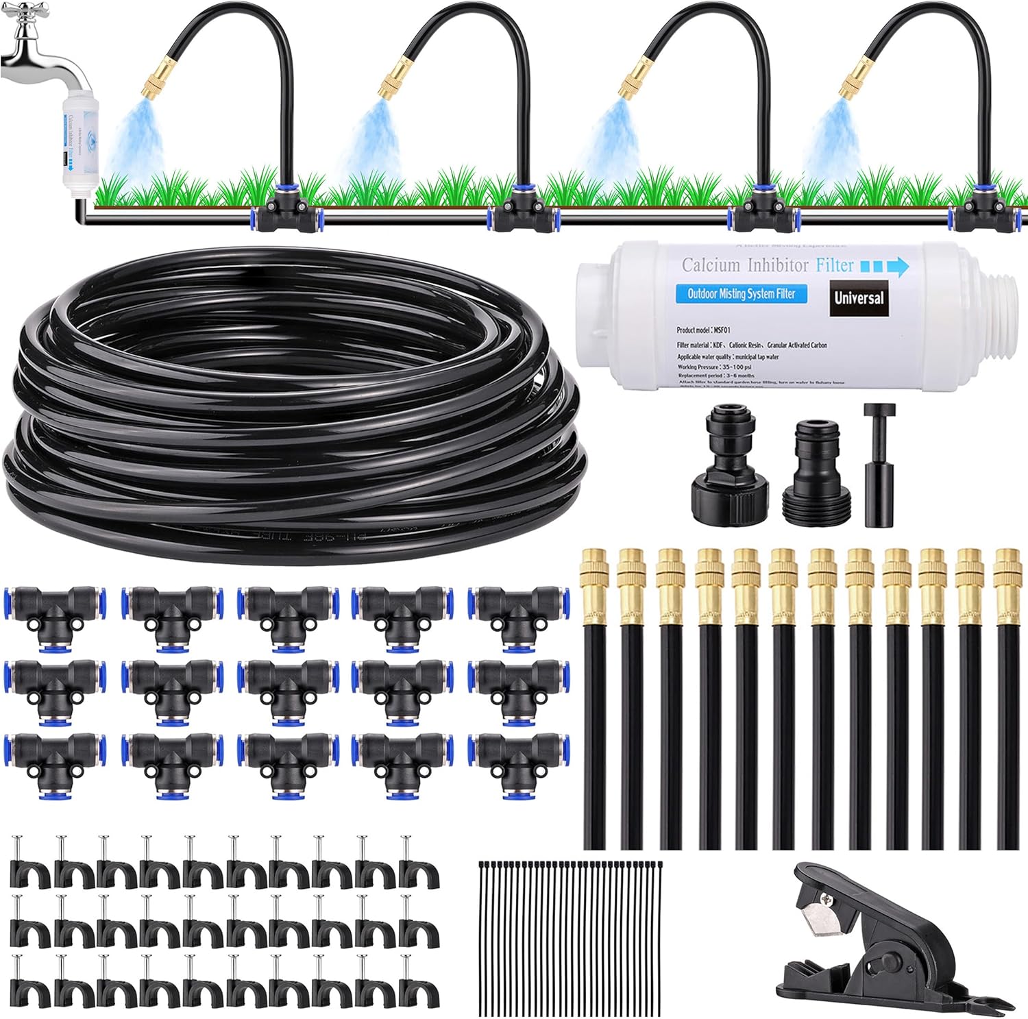 - 【Package】: Mornajina drip irrigation system kit comes with 9 kinds of accessories, including ① 1 x Calcium Inhibitor Filter; ② 1 x 50FT 5/16 inch Irrigation Tubing Hose, 6mm/0.24inch ID & 8mm/0.31inch OD; ③ 15 x 8.3 inch 360-degree Bendable Support Rod with Brass Mist Nozzle; ④ 15 x Misting Nozzles Tees; ⑤ 1 x 3/4 inch (25mm) Faucet Adapter (One side connected to 3/4 inch (25mm) Standard water tap, and the other side connected to 8mm tubing pipe); ⑥ 30 x Cable Ties; ⑦ 30 x Saddle Clamps; ⑧1 x End Plug; ⑨ 1 x Pipe Cutter. They are perfect for a comprehensive irrigation system.