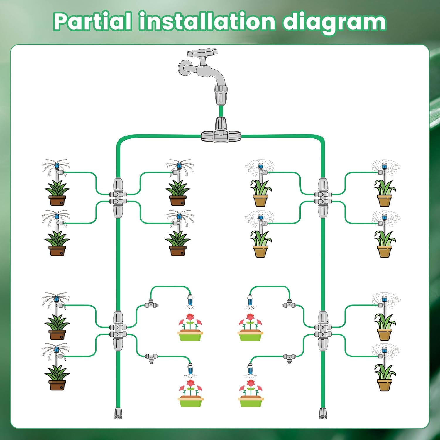 - 【Efficient Water Distribution with Flexible Layout】Create a highly customizable irrigation system for your garden using 1/2 inch tubing as the mainline and 1/4 inch tubing for distribution. With up to 32 drip emitters and adjustable mist nozzles, this garden drip irrigation system delivers water directly to the plant roots—minimizing waste and promoting healthy growth.