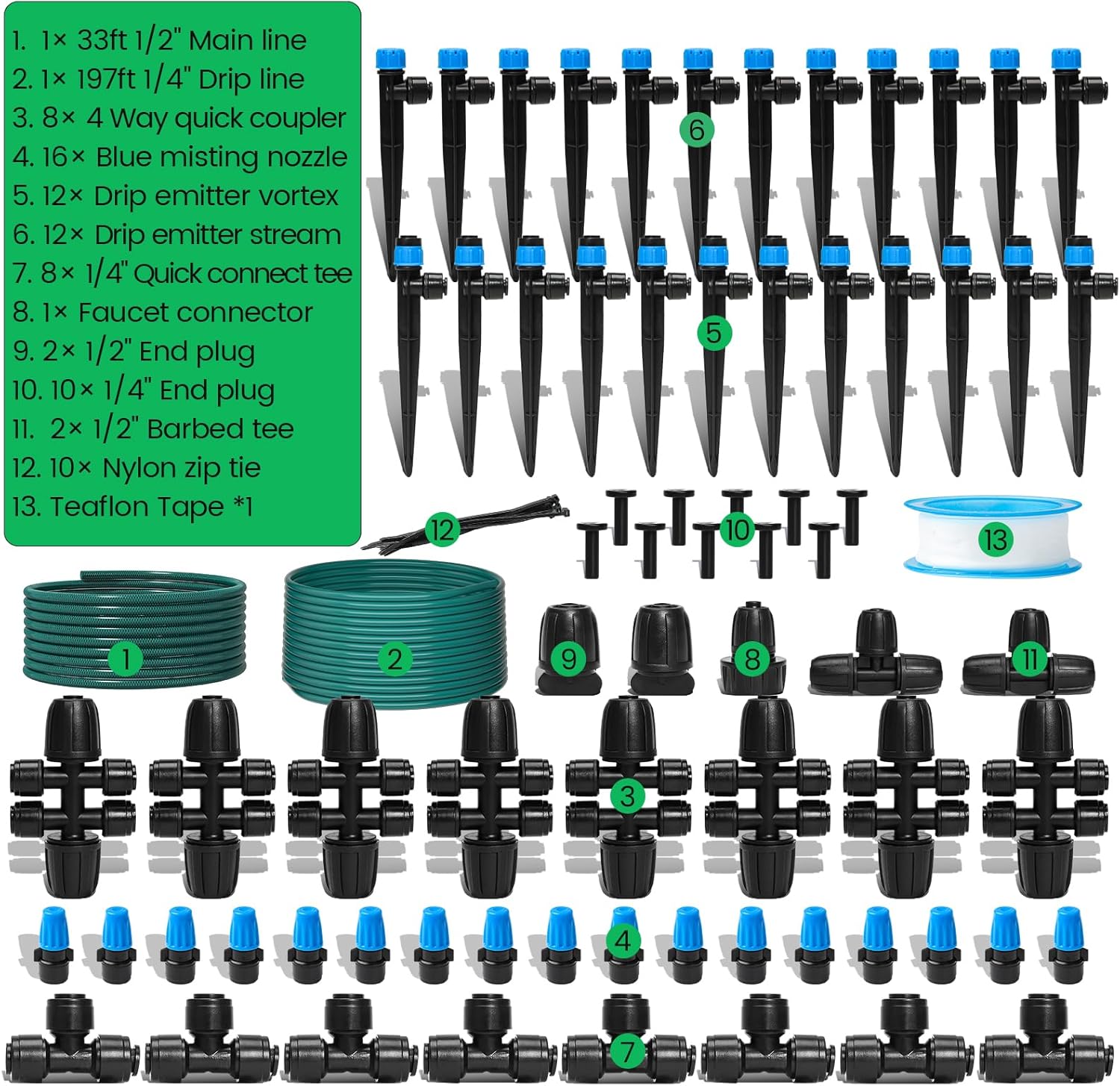 - 【230FT All-Inclusive Kit for 150 SqFt Coverage】Master your garden with Bluepro's drip irrigation system featuring 230FT tubing (33FT 1/2" main line + 197FT 1/4" distribution) and 32 professional-grade accessories. Designed to cover up to 150 sq ft, this complete garden watering system includes 8 vortex emitters, 8 stream drippers, 16 mist nozzles, quick-connect tees, and UV-resistant tubing - no extra purchases needed for greenhouses, lawns, or garden raised beds.