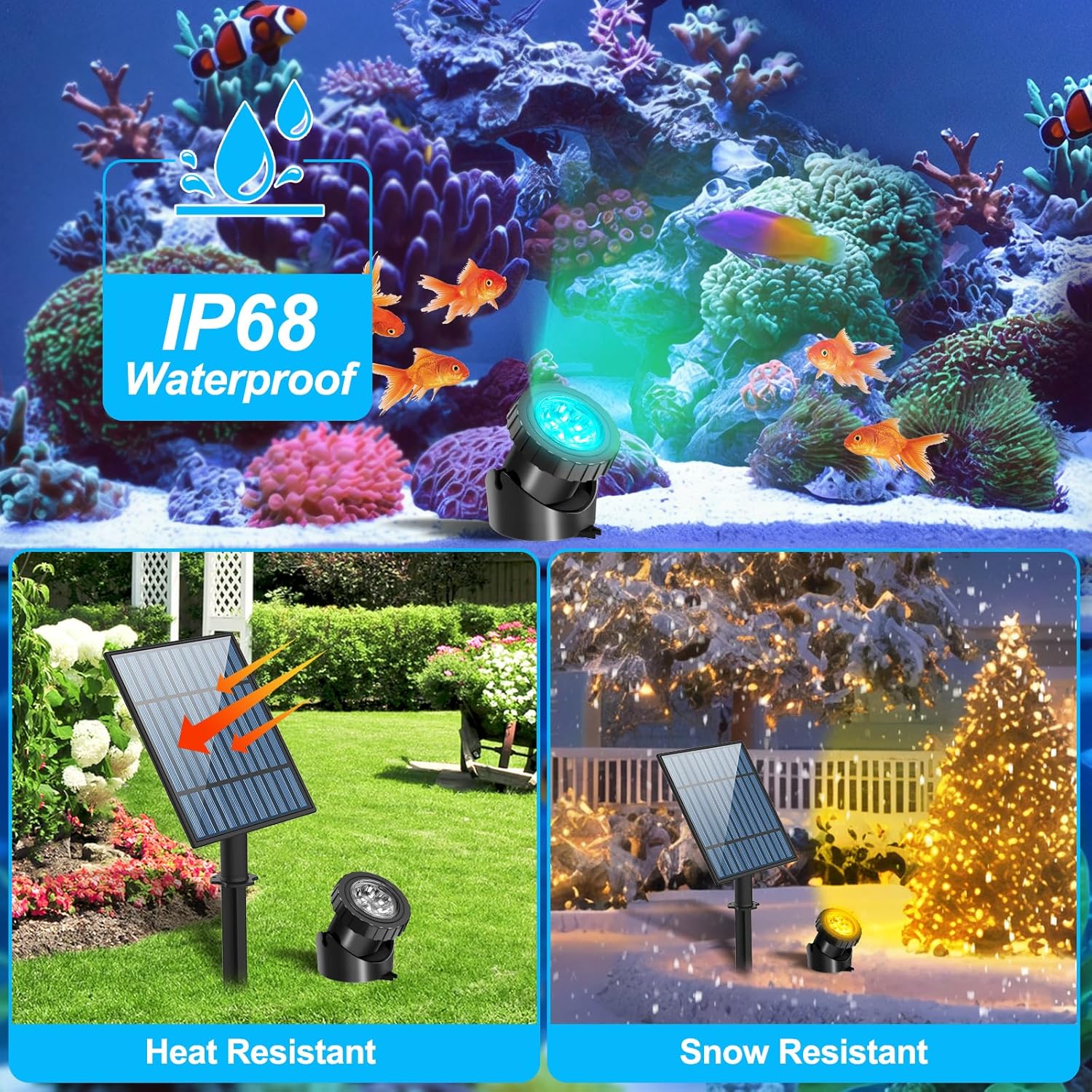 T-SUN Solar Pond Lights, 4-in-1 RGB Underwater Pond Light, Color Changing Submersible Fountain Lights, Solar Fish Tank Light Adjustable Lighting Angle for Garden Fountain, Pond, Pool Decoration