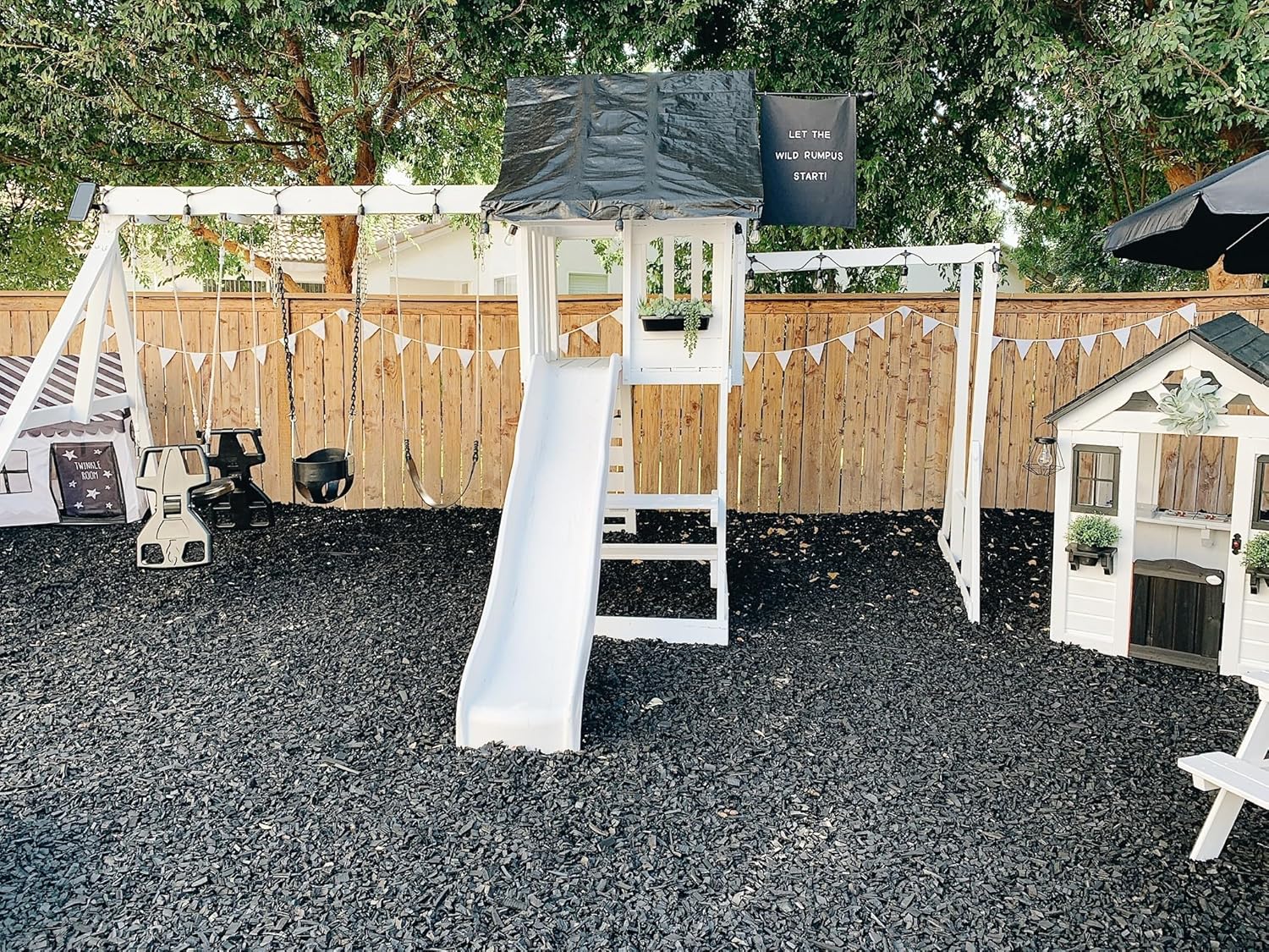 - Stays in Place in All Weather Unlike wood mulch, rubber mulch won’t blow away in wind or wash out with rain. Stays put through storms, sun, and dry seasons.