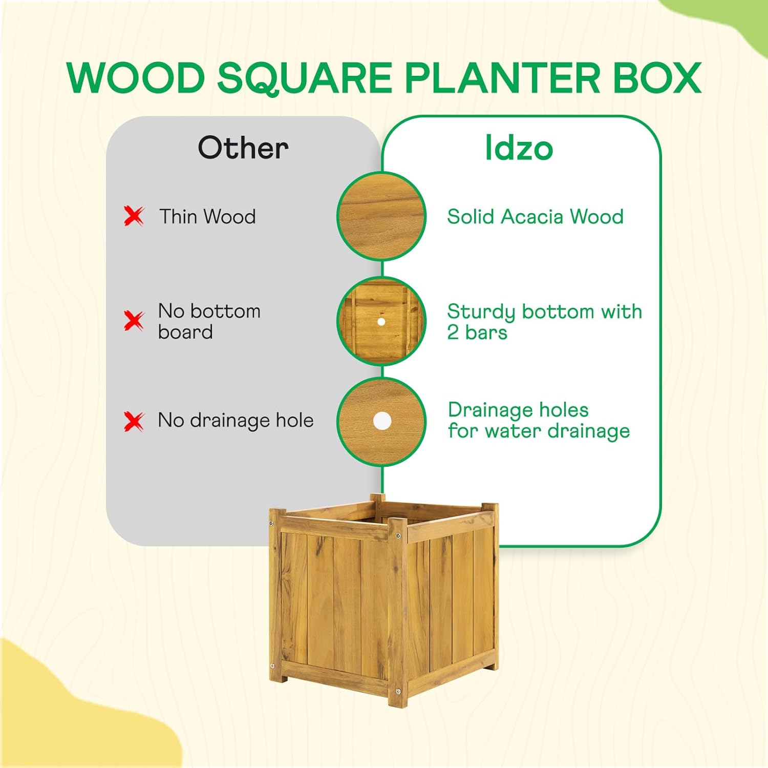 IDZO Acacia Wood Flower Planter Box for Outdoor Plants, 1pc Wooden Raised Garden Bed with Handles, Drainage Holes, Ideal for Garden and Home Décor, Golden Teak