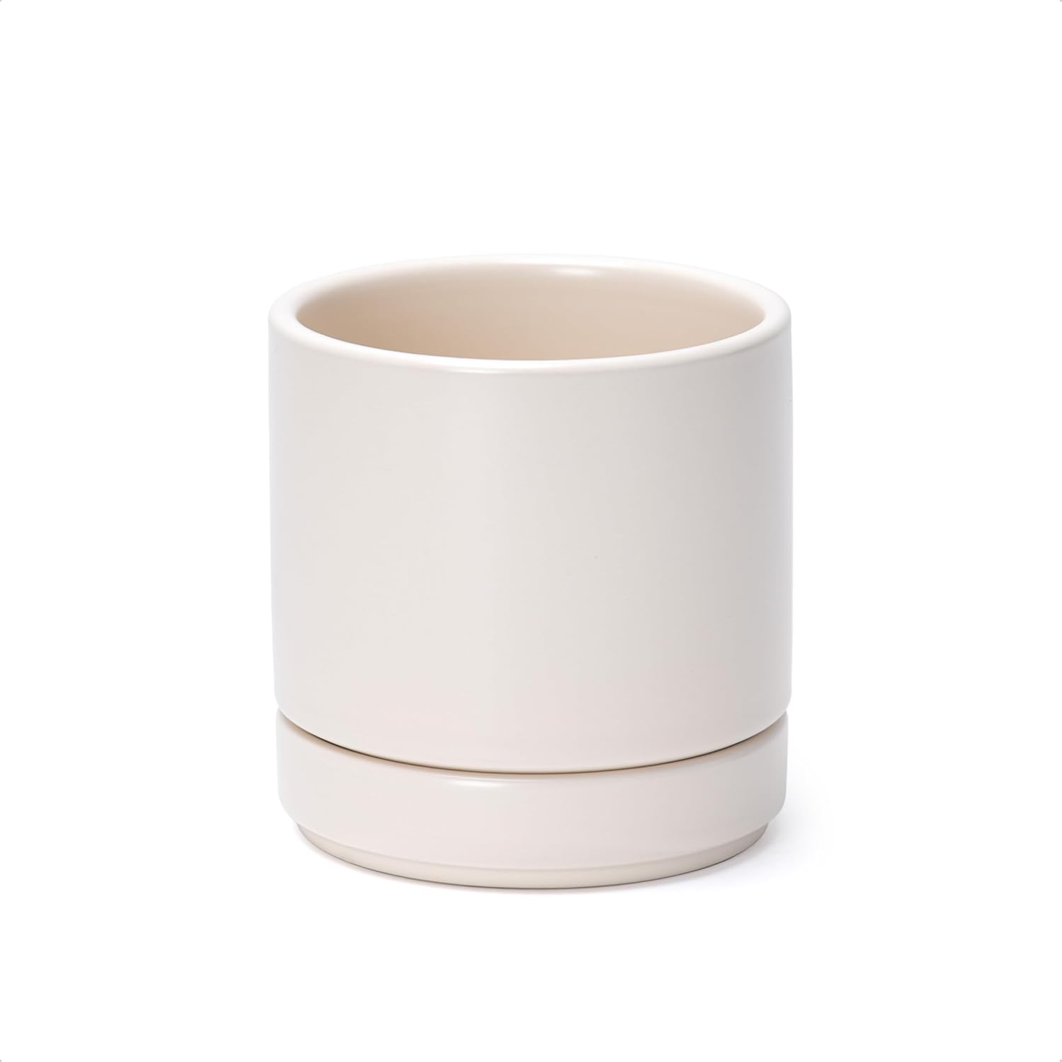 D'vine Dev 4.7 Inch Ceramic Planter Pot with Drainage Hole and Saucer, Indoor Cylinder Round Planter Pot, Oatmeal, 94-O-B-8