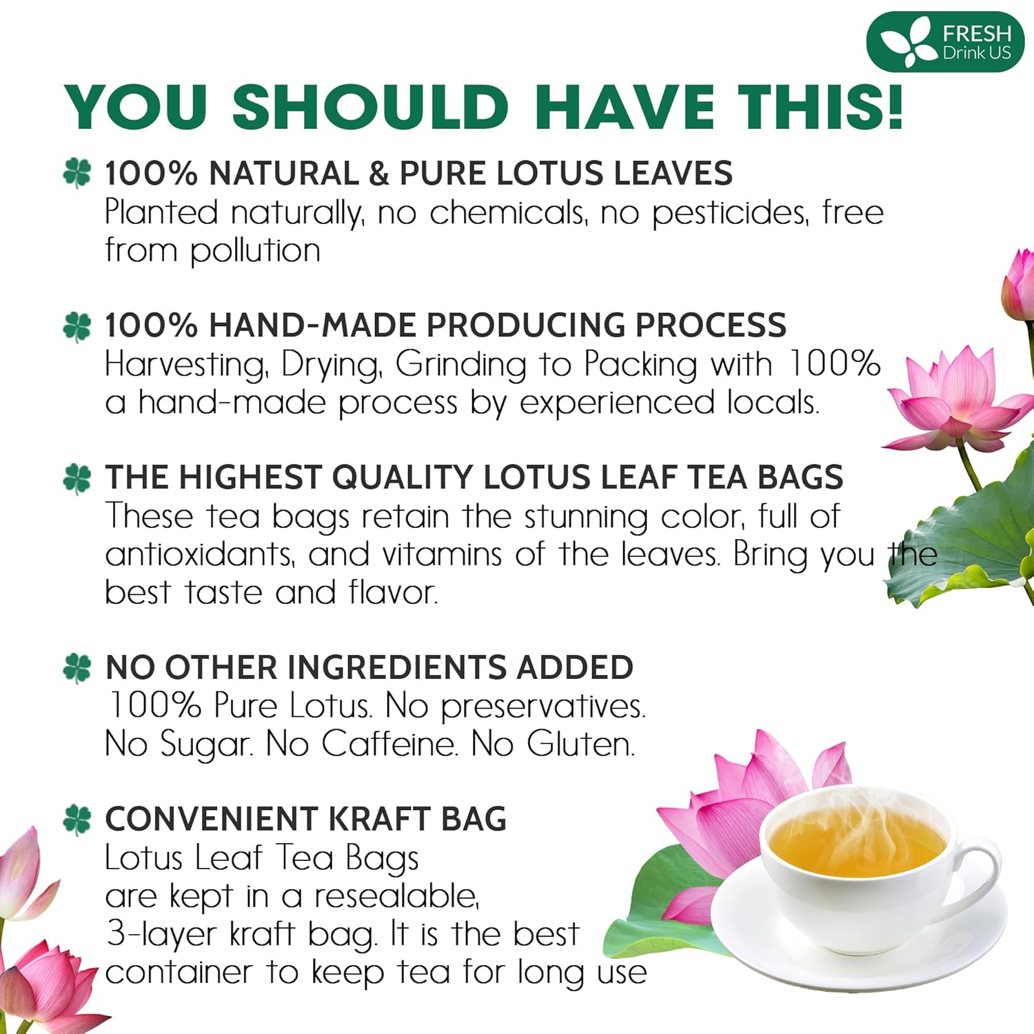 FreshDrinkUS, Premium 30 Lotus Leaf Tea Bags, 100% Natural & Pure from Lotus Leaves. Loose Leaf Lotus Herbal Tea. Made with Eco-Conscious Tea Bags. No Sugar, No Caffeine, No Gluten, Vegan.