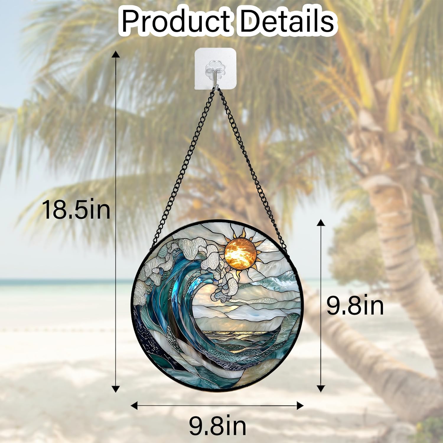 Stained Glass Window Hanging, Blue and White Waves Suncatcher Diamond Glass Panel Landscape Sun Catchers Decor for Birthday for Women, Men, Wife, Aunt, and Mom 9.8 in