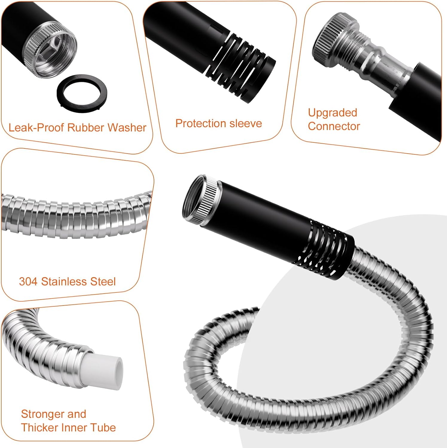 - 【Ultra-durable Stainless Steel】Made of 304 stainless steel, this hose is crush-proof, UV-resistant, and will never break or leak, outlasting rubber/vinyl hoses by 5 times.