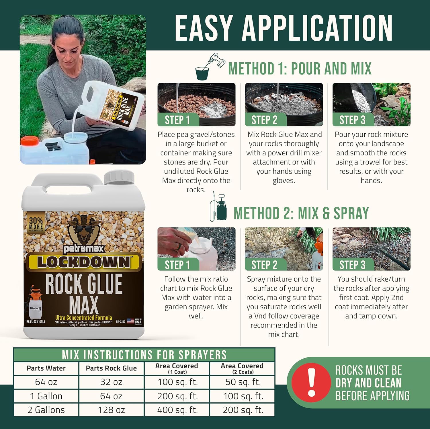 - PROFESSIONAL APPLICATION: Achieve a neat and beautiful landscape at home using our rock glue for landscape, pea gravel stabilizer, gravel and mulch stabilizer. It's ideal for use around trees, pathways, driveways, planting beds, borders, and slopes. This is a concentrated formula that works great with dilusion or can applied as is for extra strong hold.