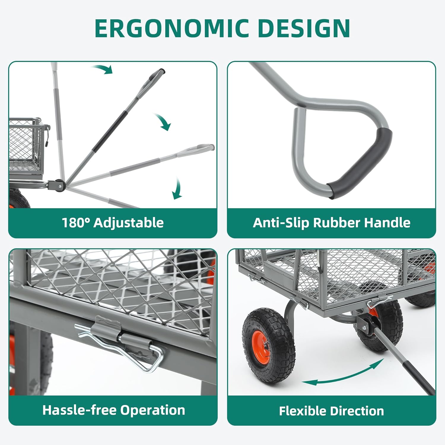 - Ergonomic Steering Handle: The 180° adjustable handle of this yard cart offers flexible directional control, significantly enhancing maneuverability. Whether you're navigating tight spaces in the yard or making precise turns on the farm, it ensures ease of use.