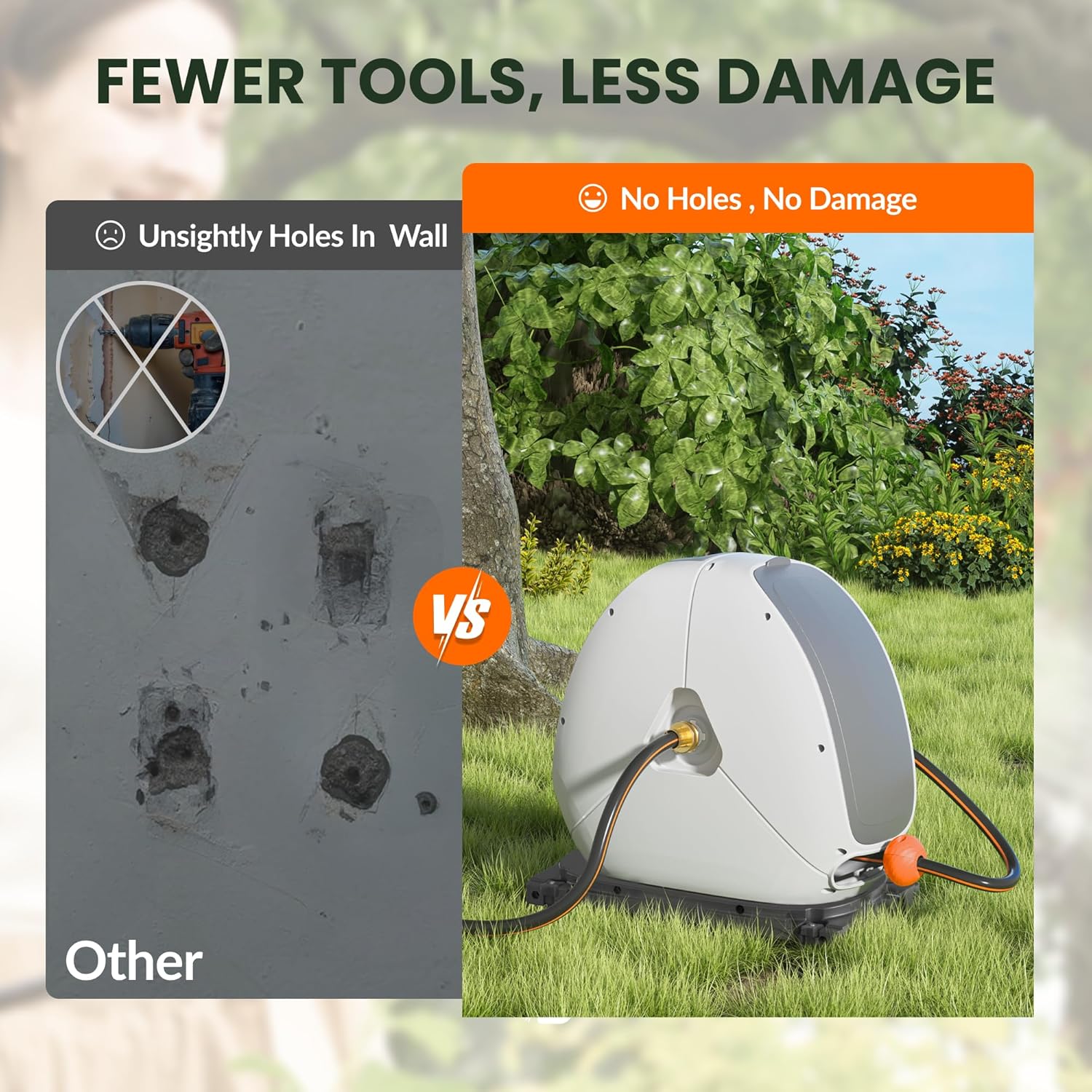 - EASY TO INSTALL & DISASSEMBLE: The retractable hose reel can be effortlessly assembled on your lawn or concrete surface. For storage, simply remove the screws on the swivel base. With its pre-assembled handle, you can easily transport the hose reel wherever you need it!