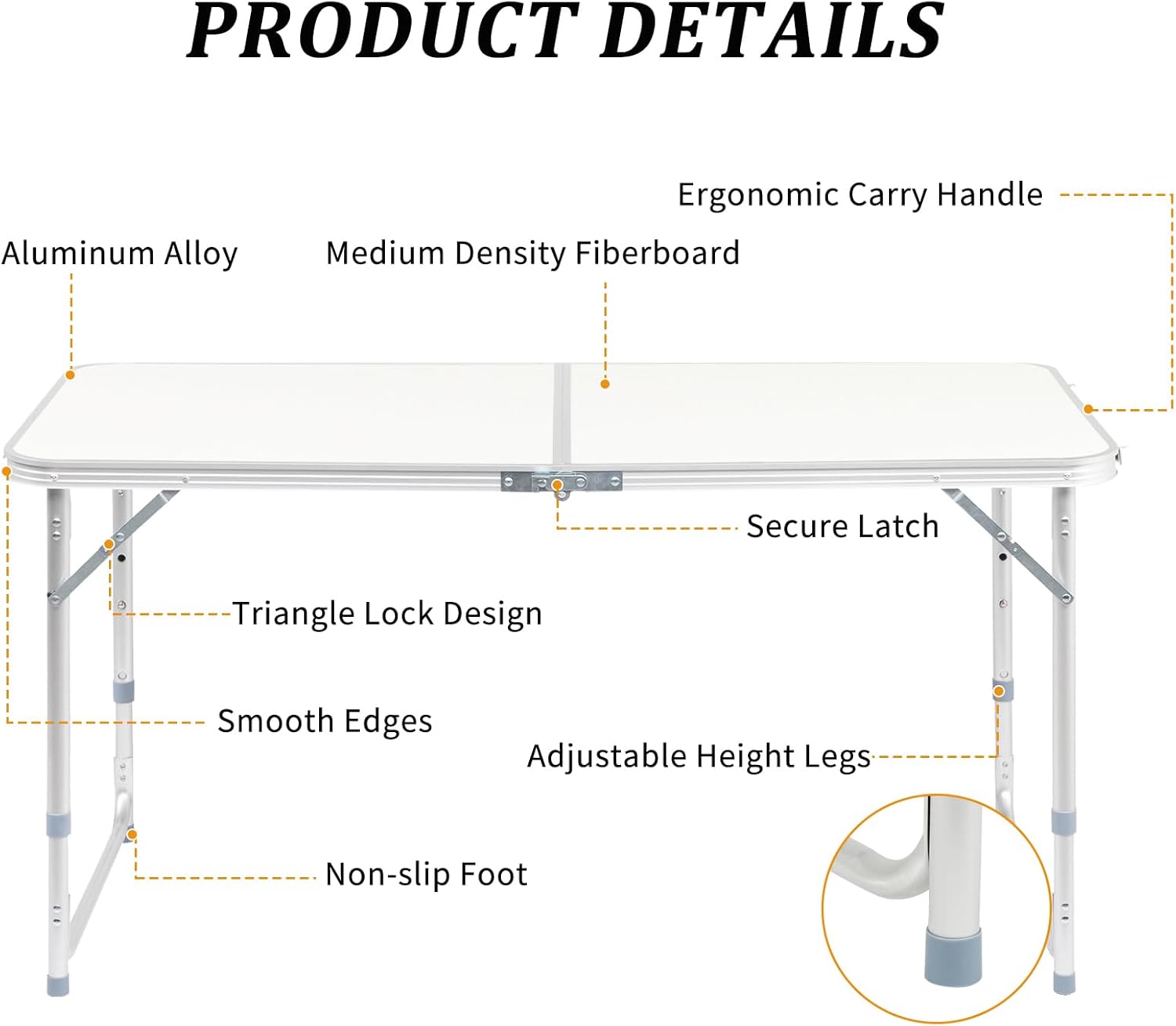 - ăAdjustable HeightăThis folding table is equipped with adjustable height aluminum table legs, allowing users to customize the height according to different needs. The height can be adjusted to 16 inches and 28 inches, providing versatility for various scenarios. The table top can be used by 4-6 people, and it is suitable for family dinners, gatherings of friends or team activities