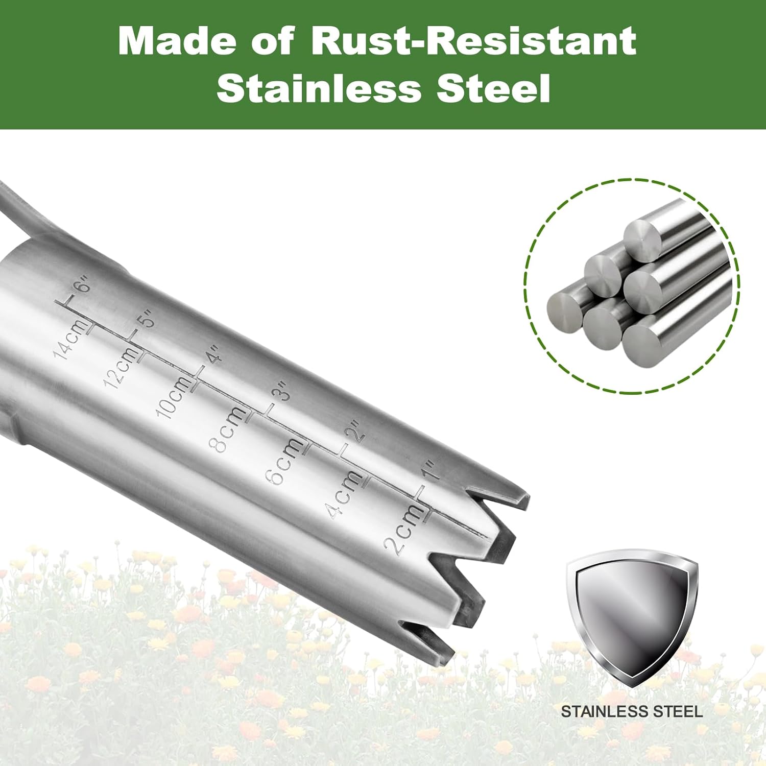 • 【High-Quality Metal Resists Bending】This bulb planting tool is made of thicker stainless steel, which has strong compression and corrosion resistance and is more sturdy and durable, which means it doesn't bend when you push it into the ground. It has sharp edges on the bottom, which can easily cut through heavy soil in your garden.