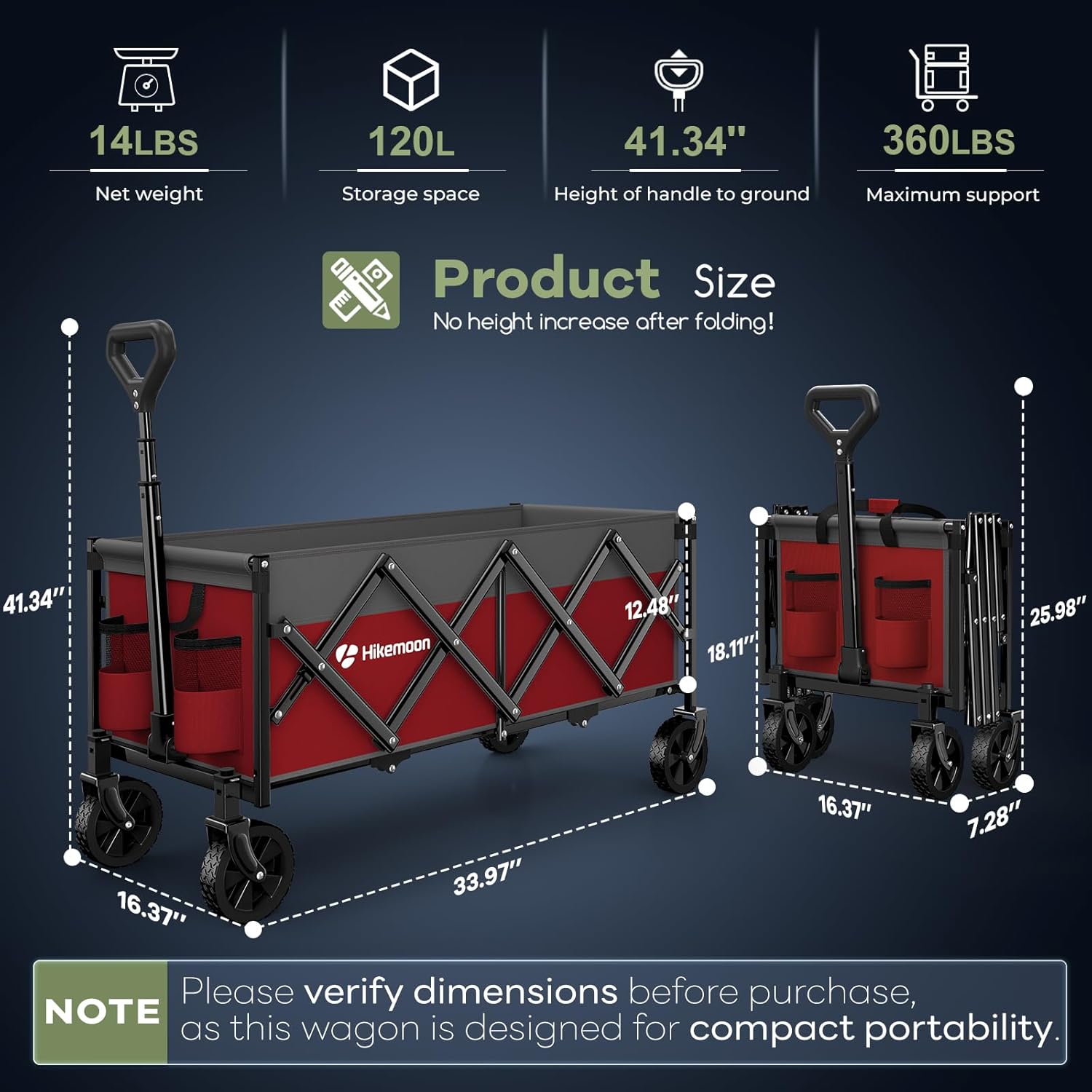 - 【𝟐𝟒-𝐇𝐨𝐮𝐫 𝐑𝐞𝐬𝐩𝐨𝐧𝐬𝐞 & 𝟏𝟐-𝐌𝐨𝐧𝐭𝐡 𝐖𝐚𝐫𝐫𝐚𝐧𝐭𝐲】: Hikemoon foldable wagons come with a 𝟏-𝐲𝐞𝐚𝐫 𝐰𝐚𝐫𝐫𝐚𝐧𝐭𝐲. Please feel free to contact us if there is any question about the collapsible utility wagon. We'll get back to you within 24 hours.