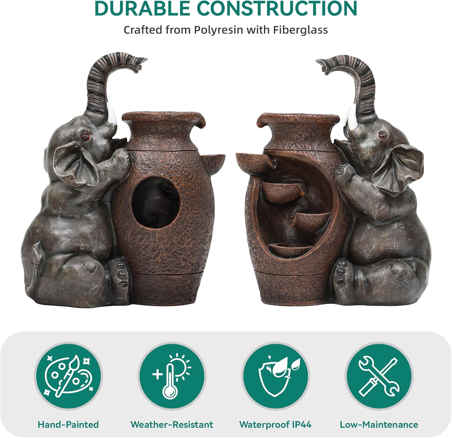 - Whimsical Elephant Design – Features a playful elephant playing by water into a jar with embossed textures and antique details. At 15.16"L x 8.66"W x 18.9"H, this fountain adds charm and becomes a unique focal point in any patio, garden, or yard.