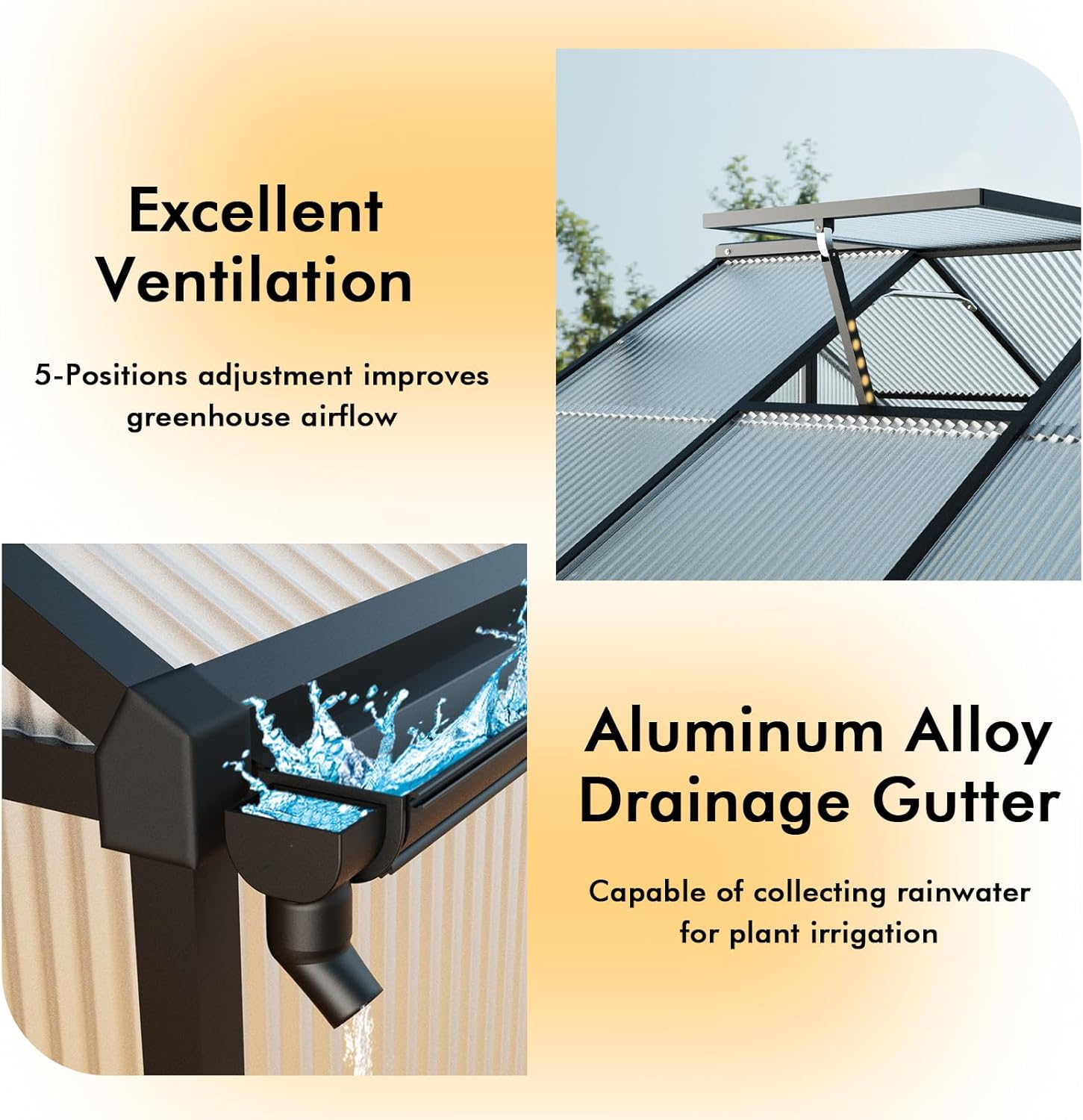 - OPTIMAL AIRFLOW AND DRAIN DESIGN – With adjustable ventilation windows and a lockable door, this green houses for outside kit can ensure both fresh air circulation and safety for your plants. The built-in gutter system of the greenhouse roof allows for efficient rainwater drainage. So you can easily collect water for your plants. This design keeps your greenhouse cool and comfortable while providing a secure environment for your plants to thrive