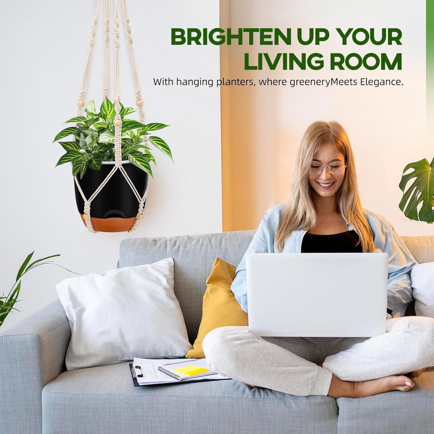 2-Pack 7.2-Inch Self-Watering Hanging Planters for Indoor & Outdoor Plants,34-Inch macrame hanger plant pots indoor with drainage,Small Hanging Planters & Baskets in Black,With two sets of hooks