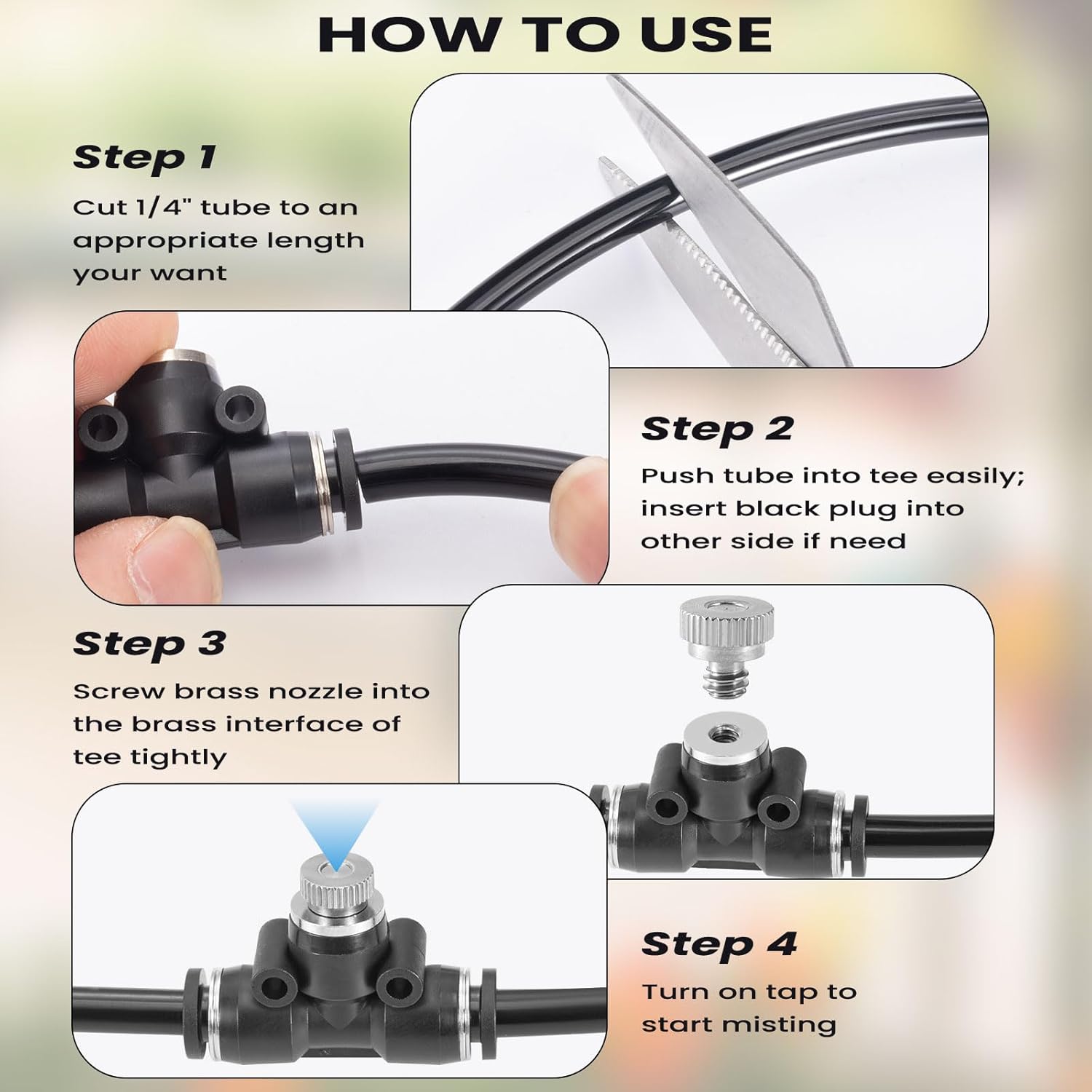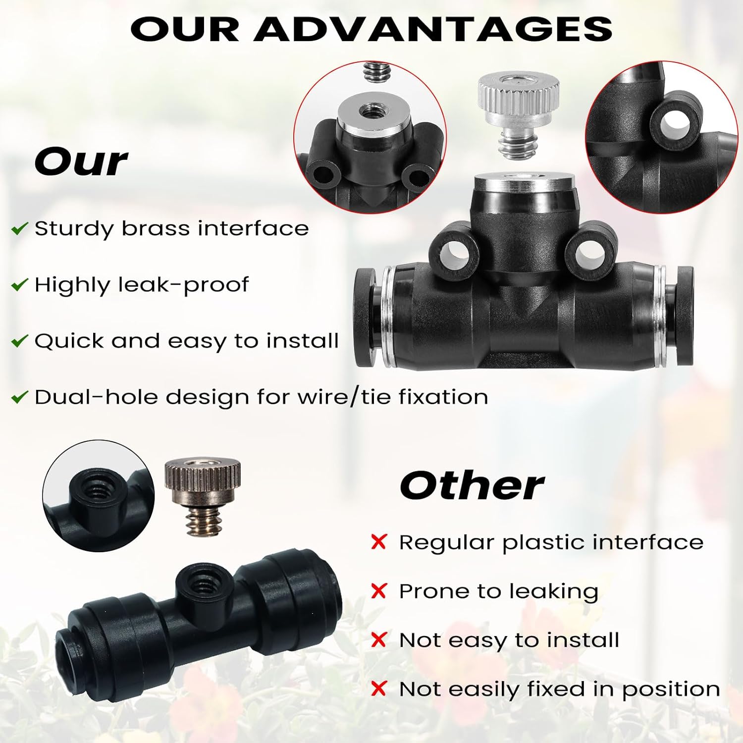 - 【Quick Installation and Leak-proof】Easy to install without any additional tools.Push the tube onto the tee ends and tighten the nozzles or plugs.Design of sliding lock increases tightness,providing lasting and a secure leak-proof connection for cooling system.When you want to turn off the mist,you can use a plug to stop misting